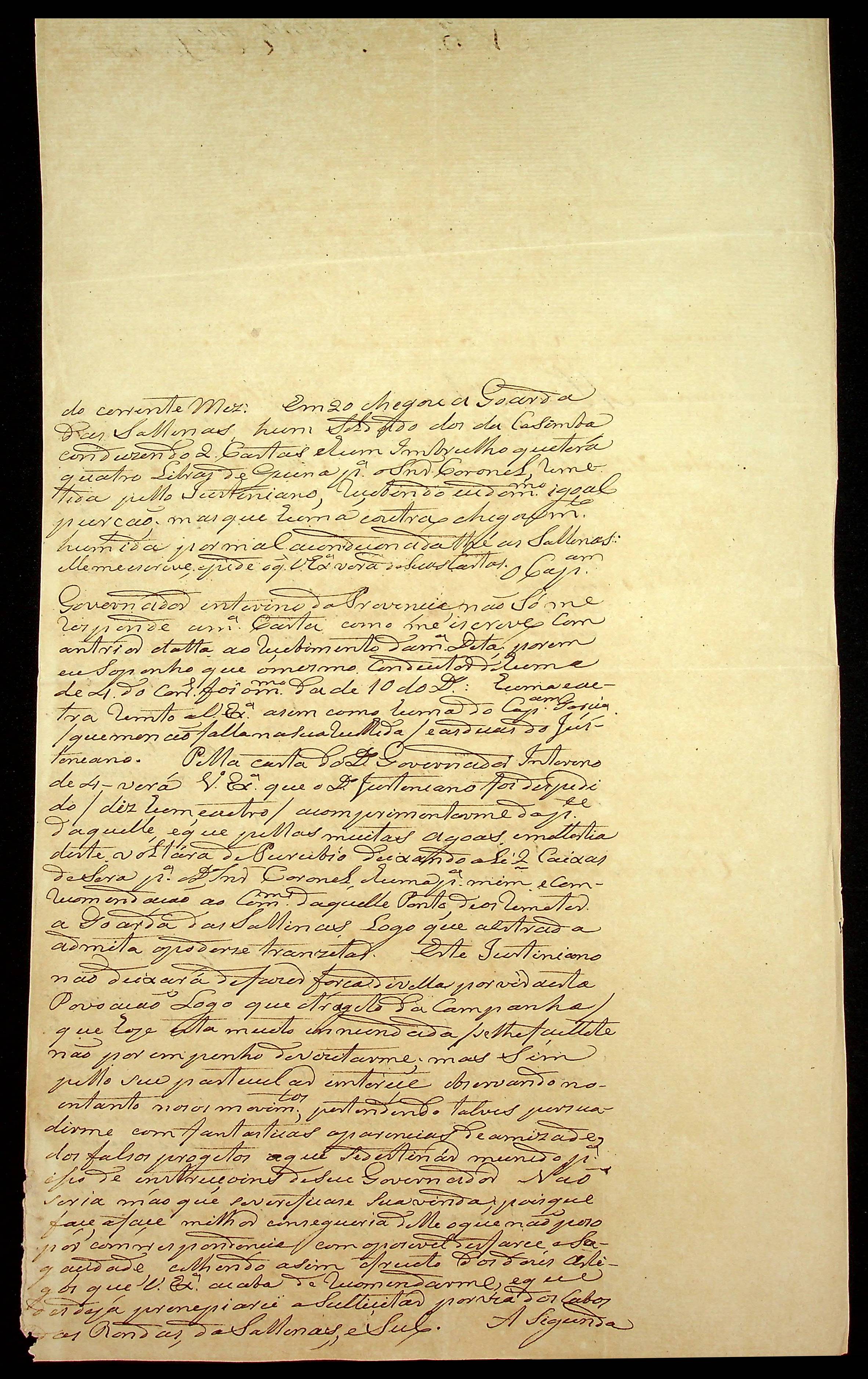 CARTA do [Alferes Comandante] Luiz Antônio de Souza ao [Governador e Capitão-General da Capitania de Mato Grosso] João Carlos Augusto d’Oeynhausen e Gravenberg.
