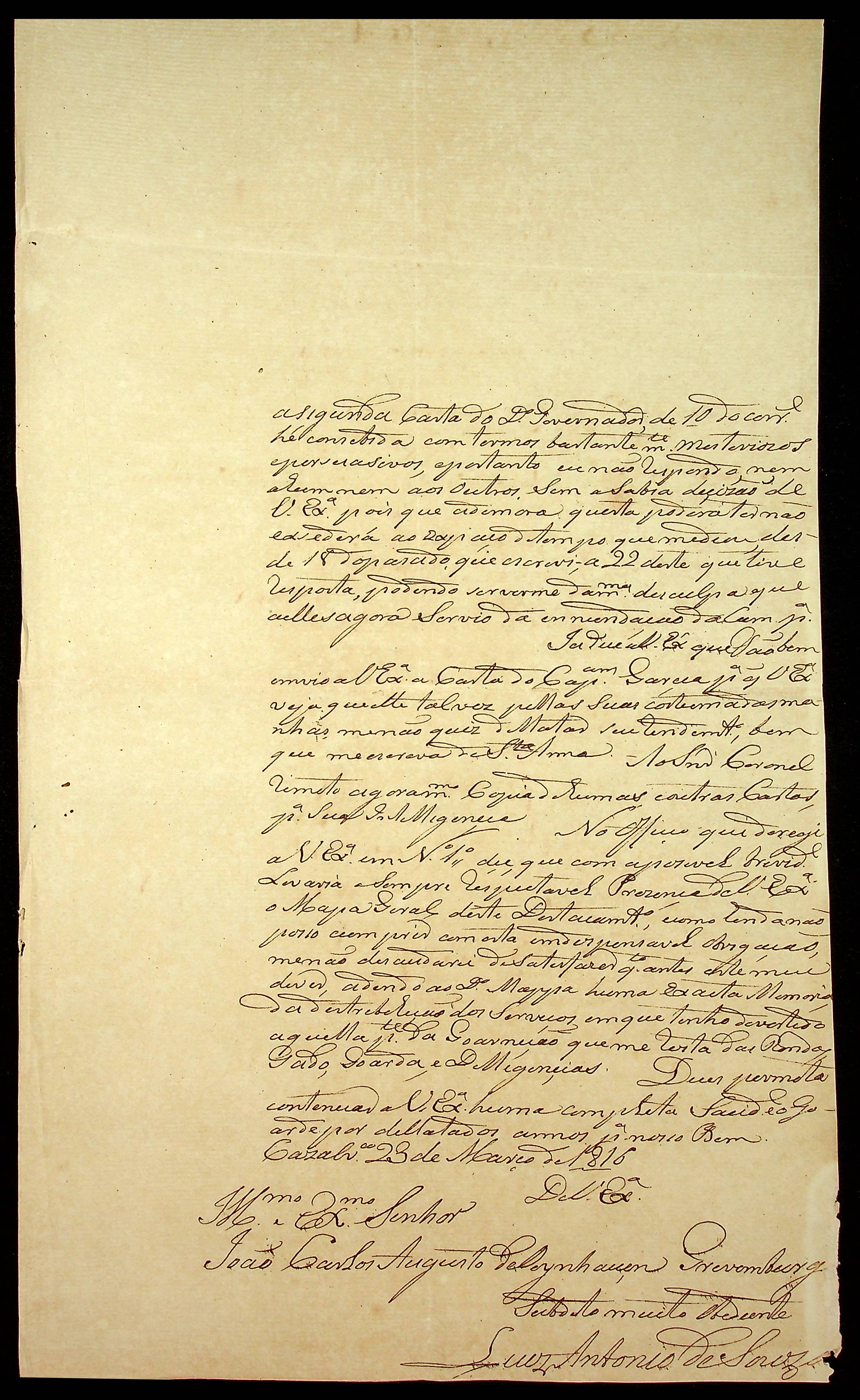 CARTA do [Alferes Comandante] Luiz Antônio de Souza ao [Governador e Capitão-General da Capitania de Mato Grosso] João Carlos Augusto d’Oeynhausen e Gravenberg.