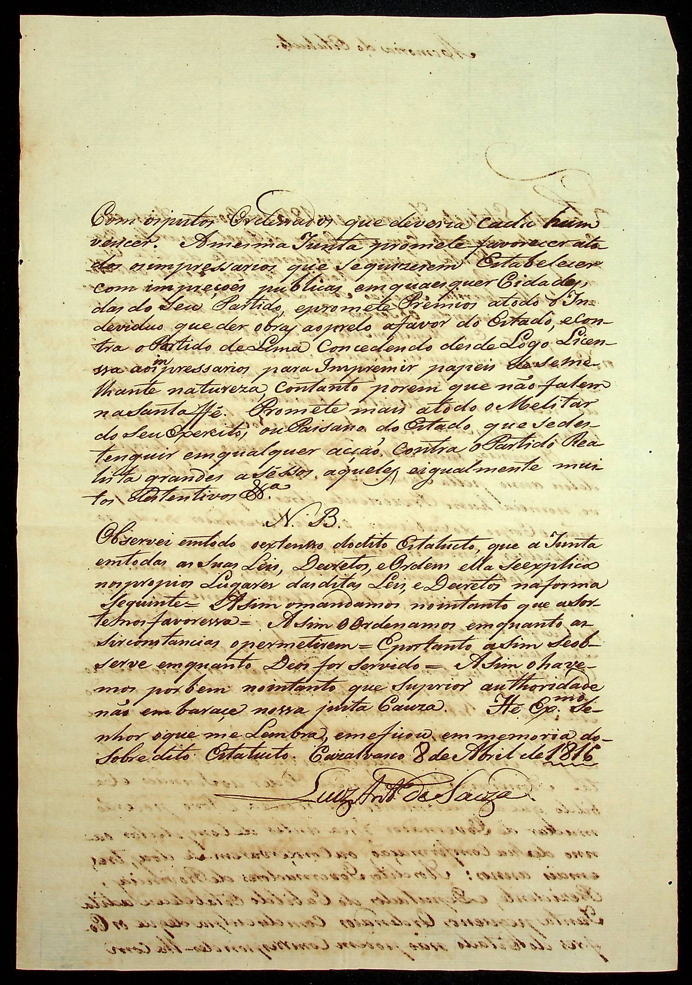 CARTA do Alferes Comandante Luiz Antônio de Souza ao [Governador e Capitão-General da Capitania de Mato Grosso] João Carlos Augusto d’Oeynhausen e Gravenberg.
