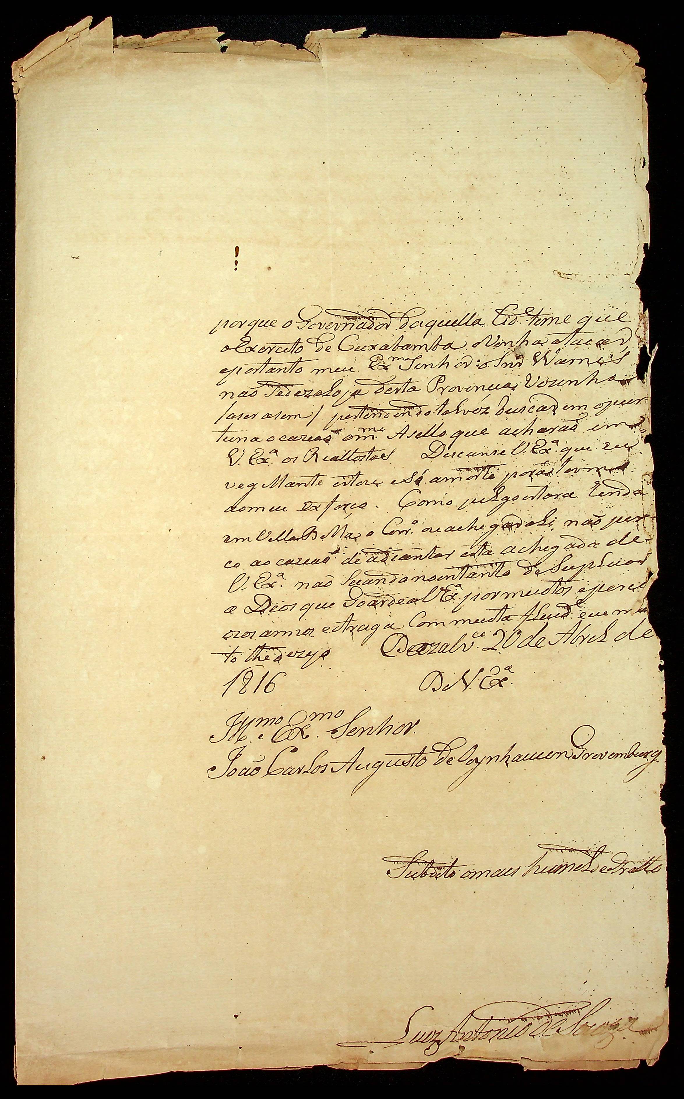 CARTA do [Alferes Comandante] Luiz Antônio de Souza ao [Governador e Capitão-General da Capitania de Mato Grosso] João Carlos Augusto d’Oeynhausen e Gravenberg.