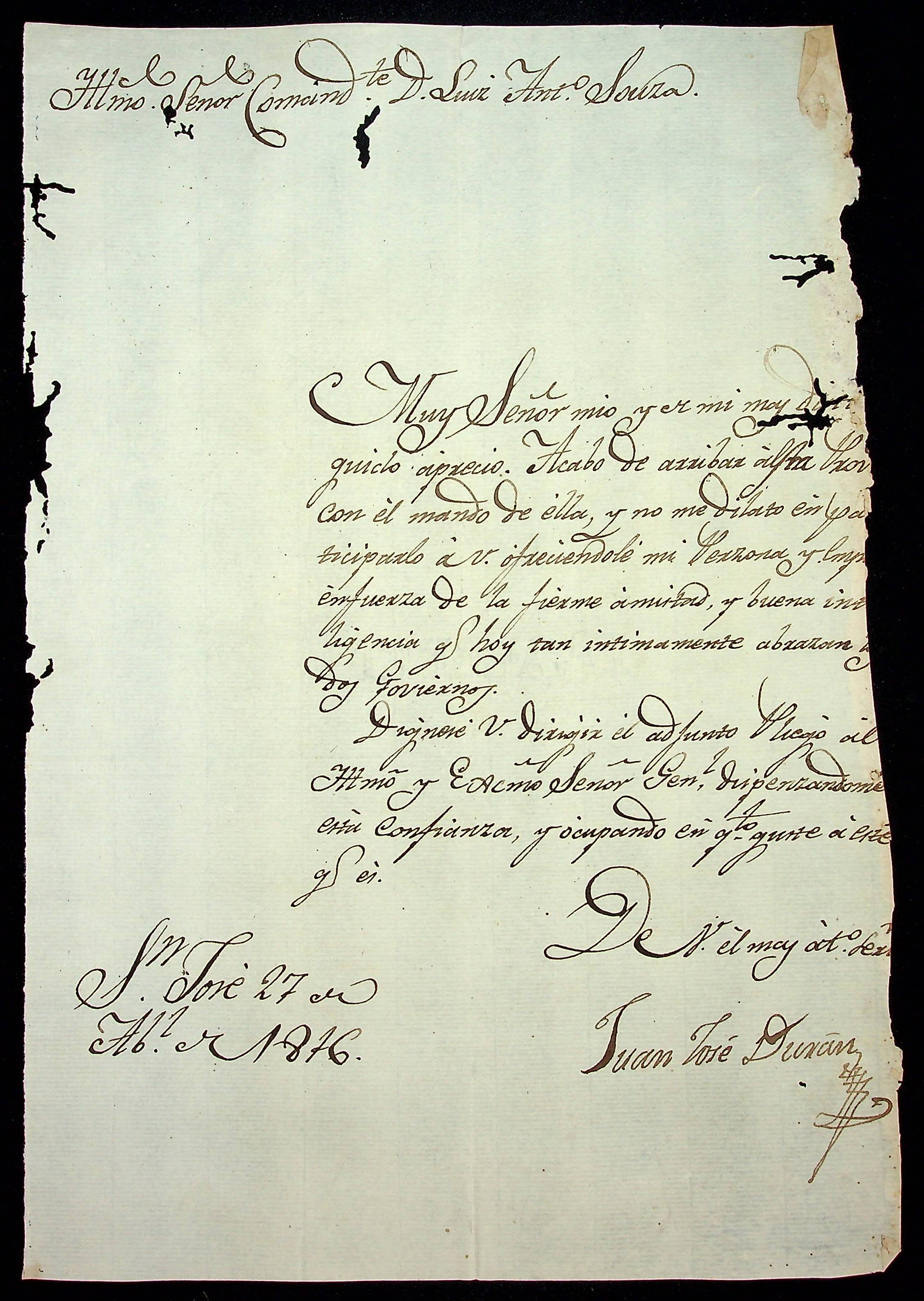 CARTA de Juan José Duran ao Alferes Luís Antônio Souza.