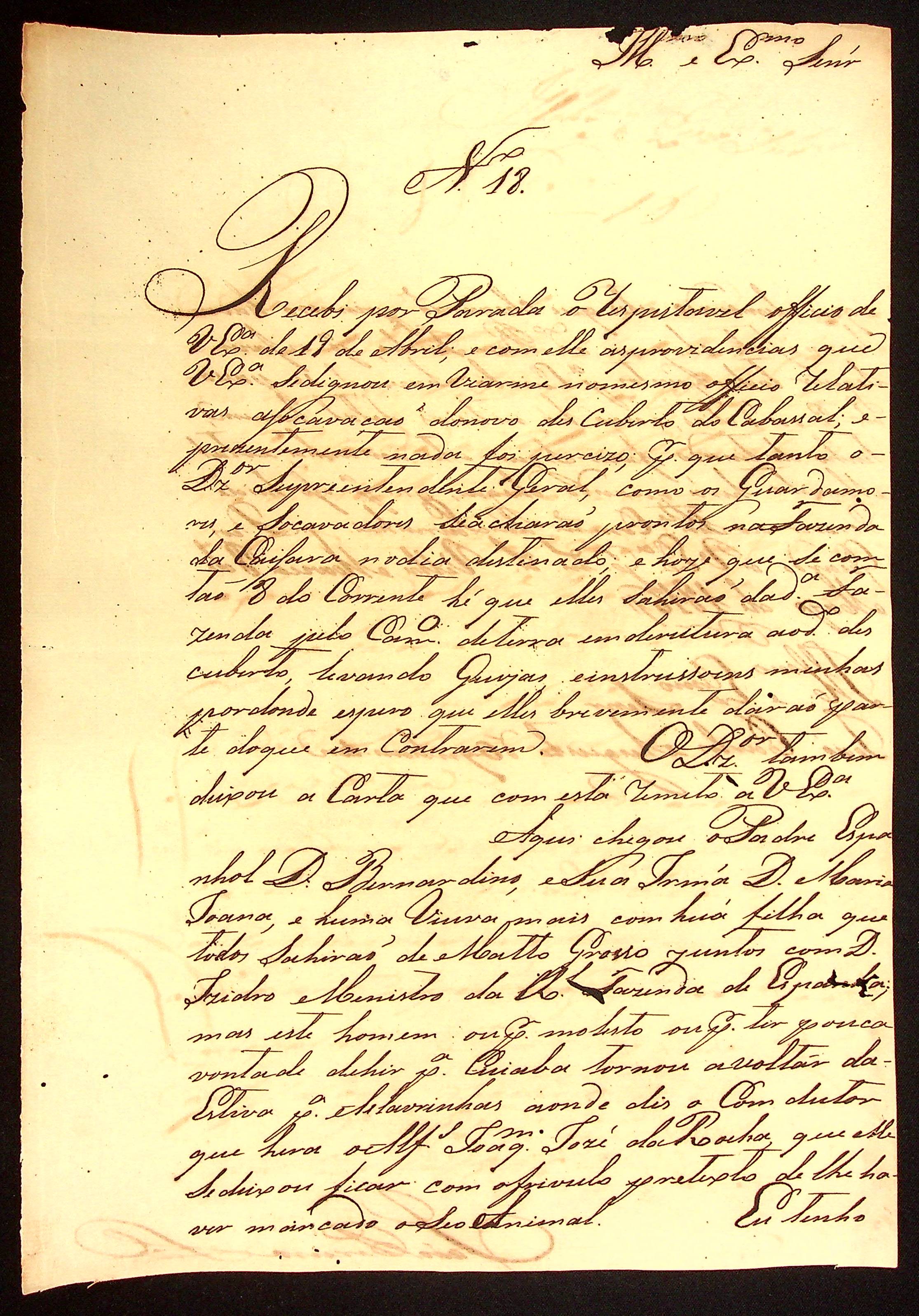 CARTA do [Sargento-mor] João Pereira Leite ao [Governador e Capitão-General da Capitania de Mato Grosso] João Carlos Augusto d’Oeynhausen e Gravenberg.