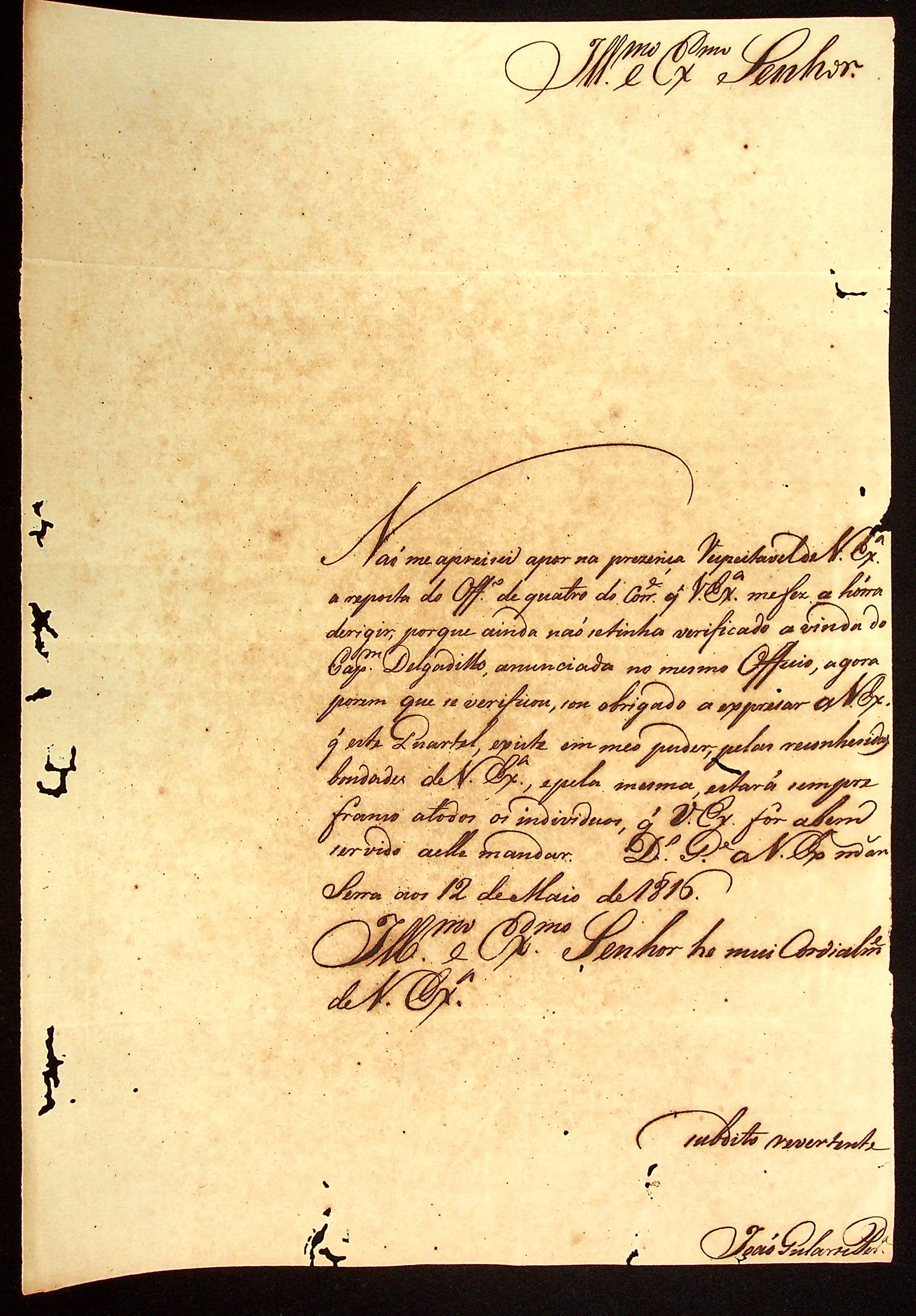 CARTA do [Capitão] João Goulart Pereira ao [Governador e Capitão-General da Capitania de Mato Grosso] João Carlos Augusto d’Oeynhausen e Gravenberg.