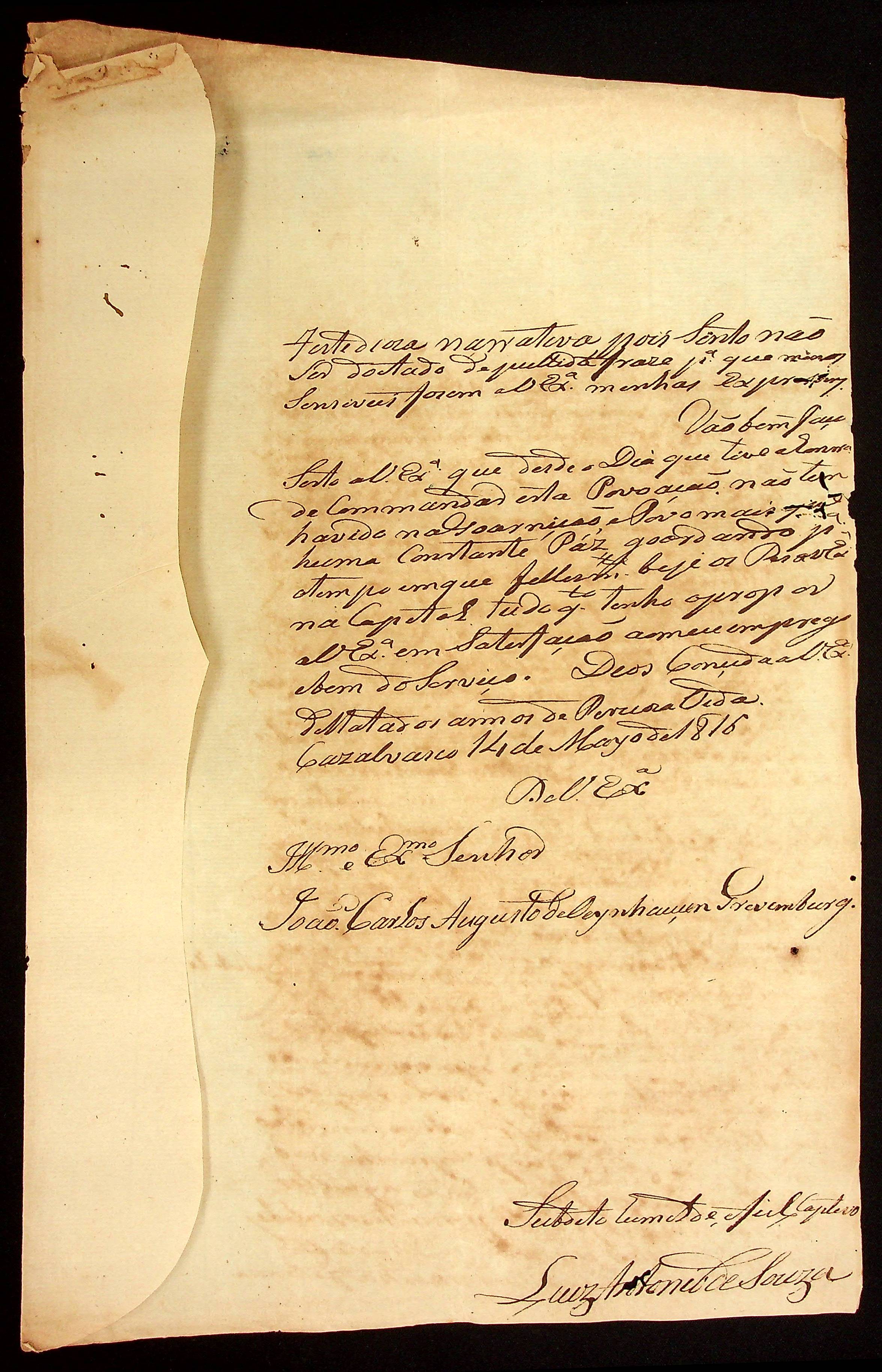 CARTA do [Alferes Comandante] Luiz Antônio de Souza ao [Governador e Capitão-General da Capitania de Mato Grosso] João Carlos Augusto d’Oeynhausen e Gravenberg.