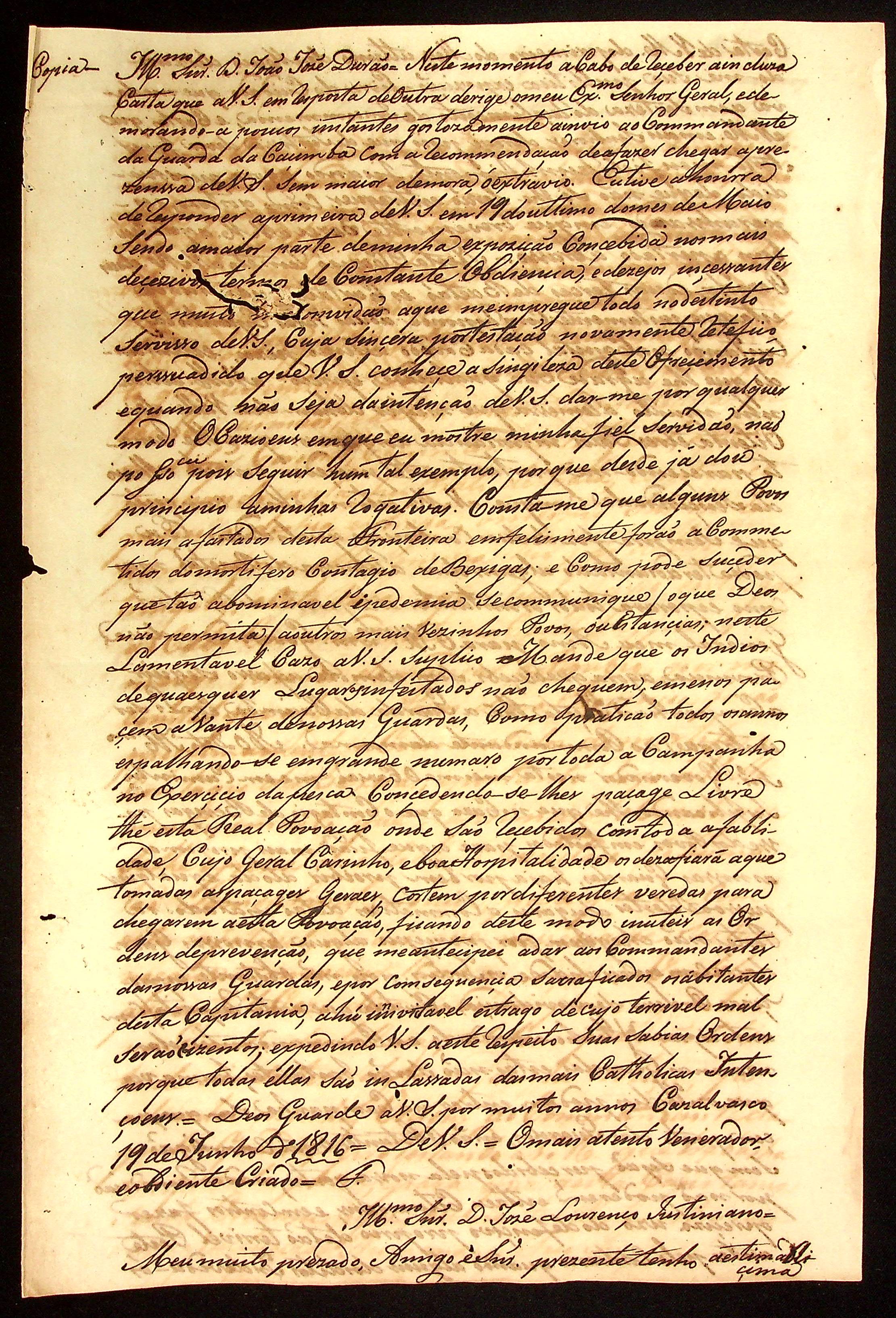 CARTA (Conjunto/cópia) do [Alferes Comandante Luiz Antônio de Souza] ao Capitão João José Duran e José Lourenço Justiniano.