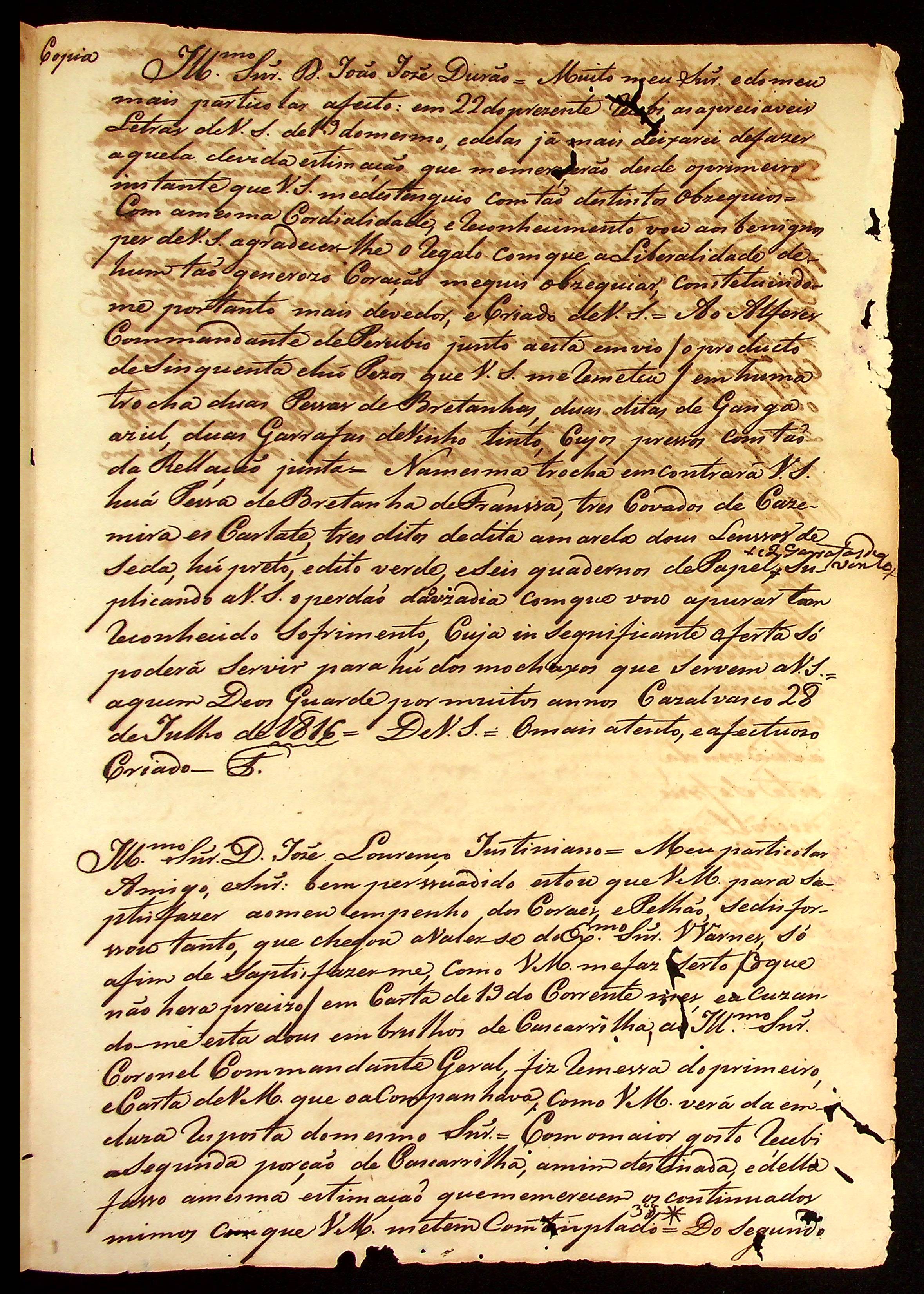 CARTA (Conjunto/cópia) do [Alferes Comandante Luiz Antônio de Souza] ao Capitão João José Duran e José Lourenço Justiniano.