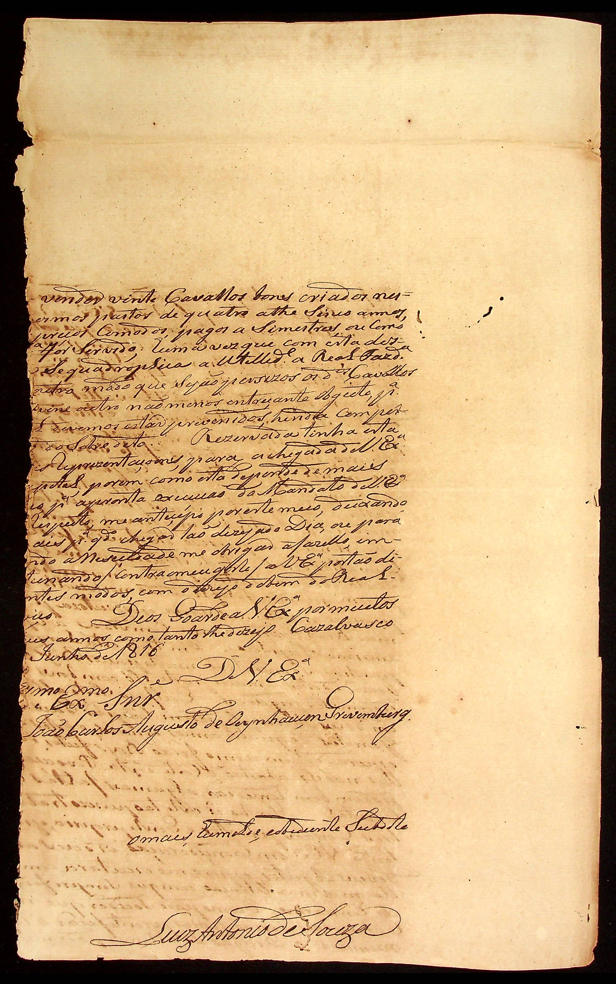 CARTA do [Alferes Comandante] Luiz Antônio de Souza ao [Governador e Capitão-General da Capitania de Mato Grosso] João Carlos Augusto d’Oeynhausen e Gravenberg.