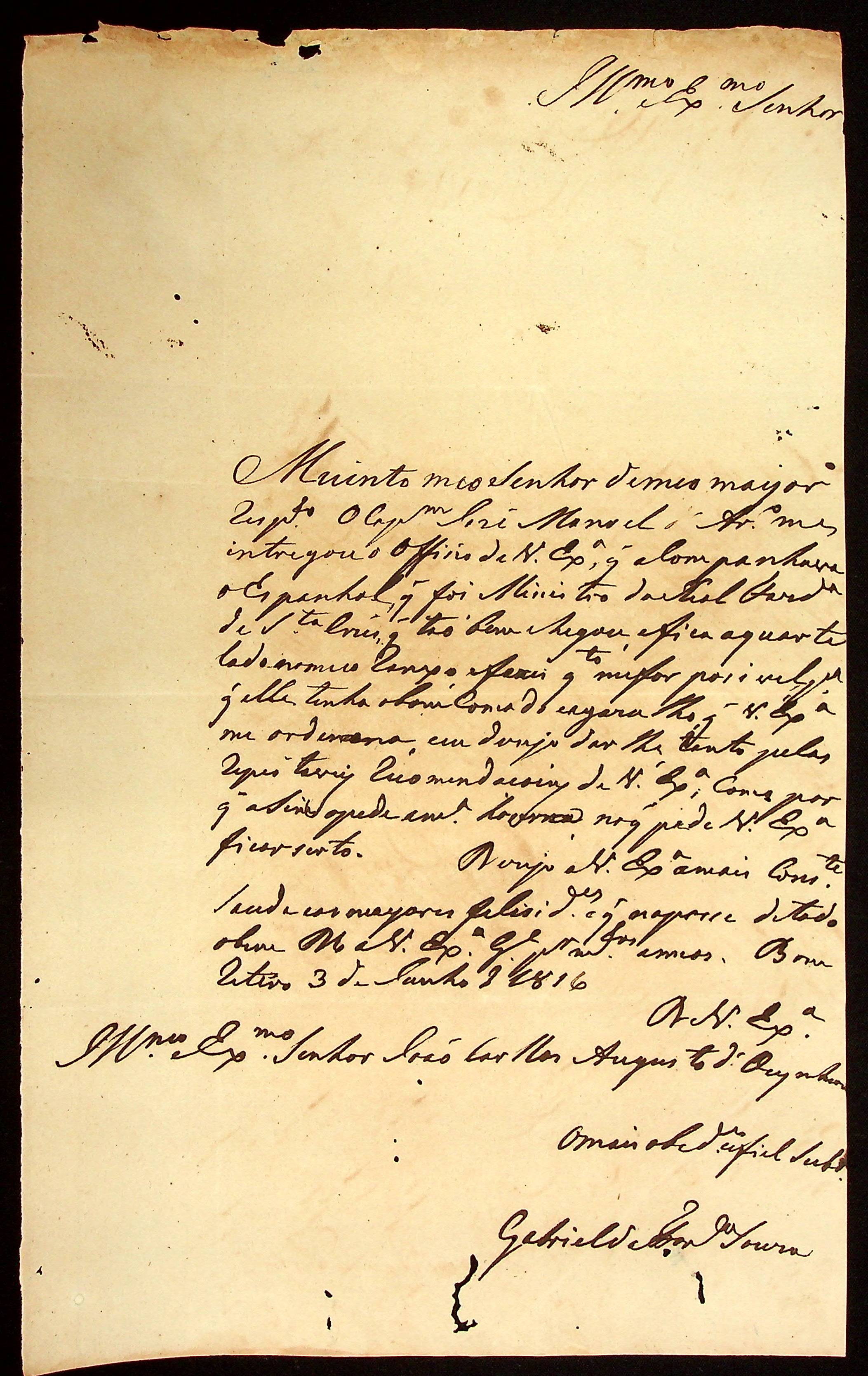 CARTA do [Coronel] Gabriel da Fonseca Souza ao [Governador e Capitão-General da Capitania de Mato Grosso] João Carlos Augusto d’Oeynhausen e Gravenberg.