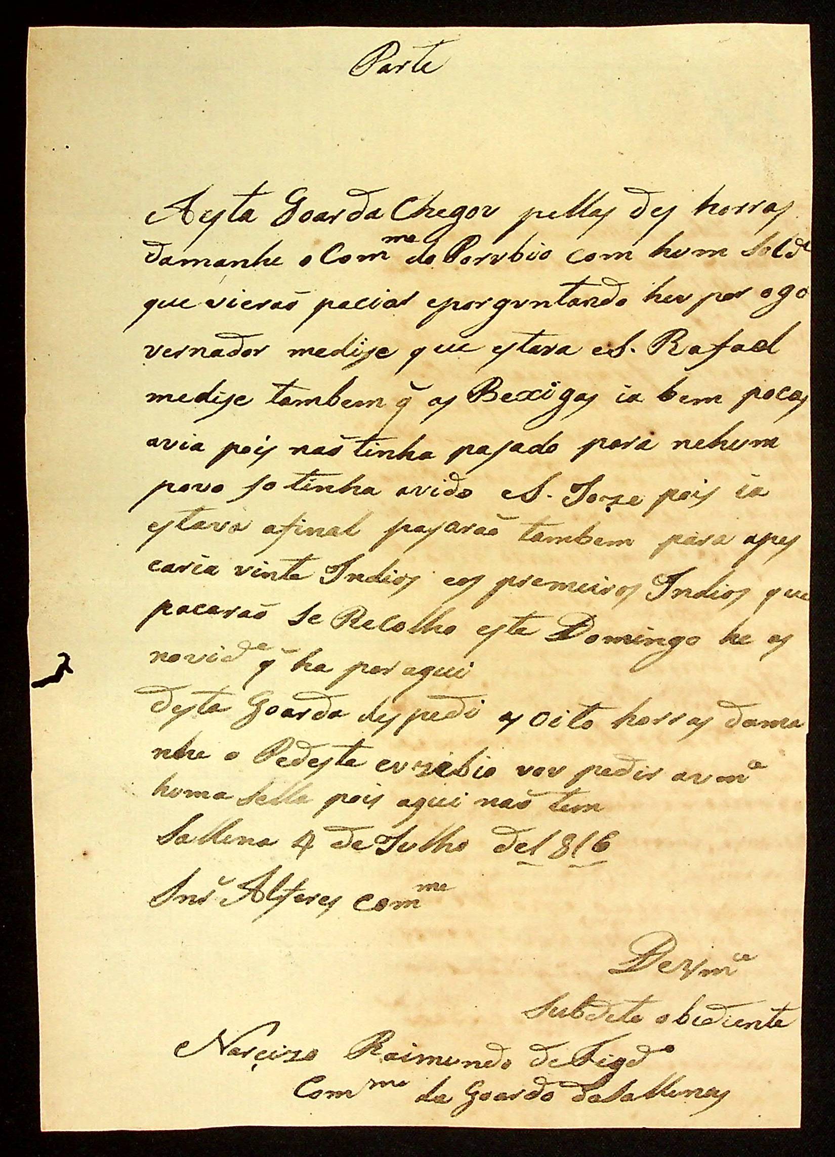 CARTA do Alferes Comandante de Casalvasco Luiz Antônio de Souza ao Governador e Capitão-General da Capitania de Mato Grosso João Carlos Augusto d’Oeynhausen e Gravenberg.