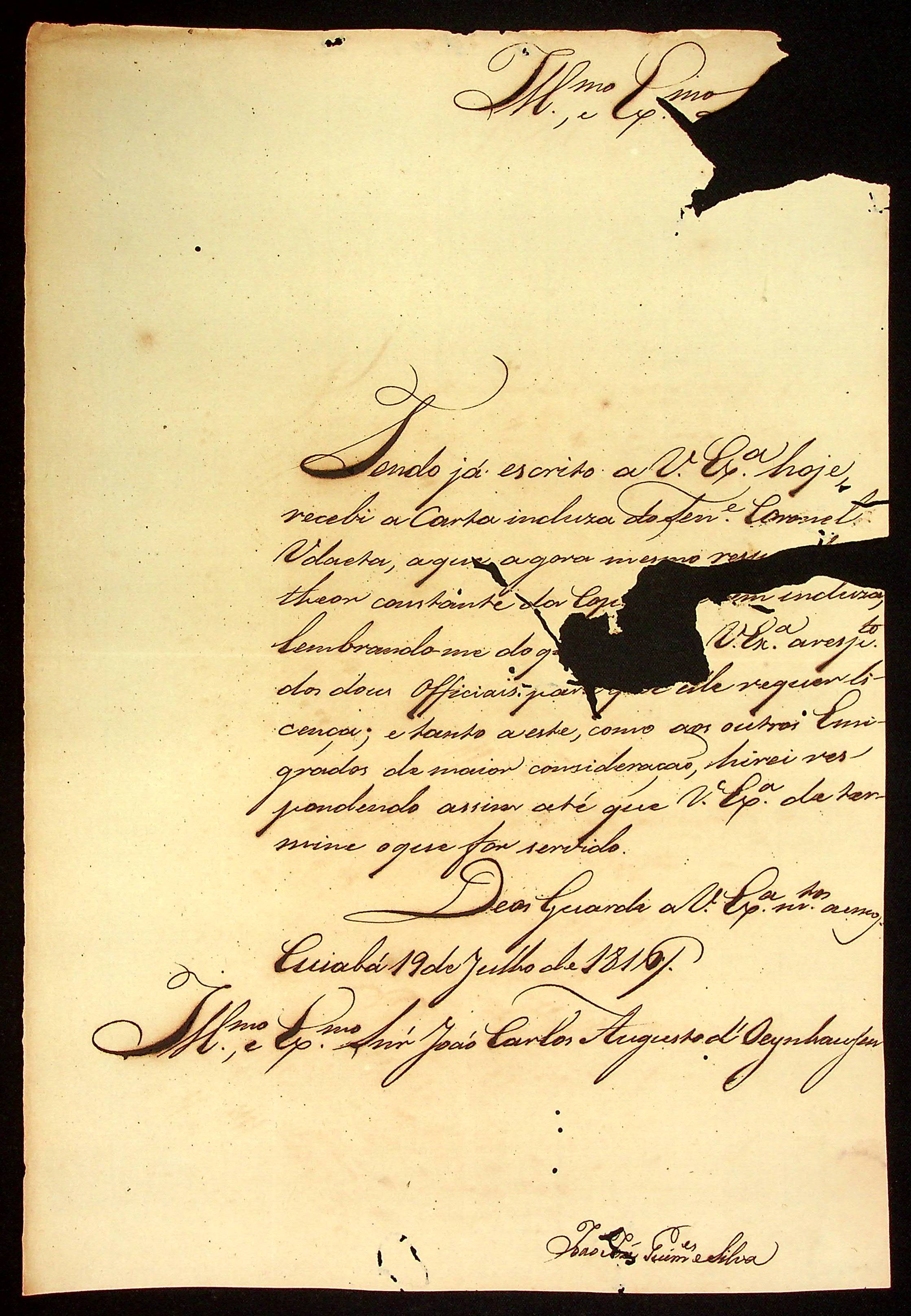 CARTA do [Capitão dos Ordenanças] João José Guimarães e Silva ao [Governador e Capitão-General da Capitania de Mato Grosso] João Carlos Augusto d’Oeynhausen e Gravenberg.
