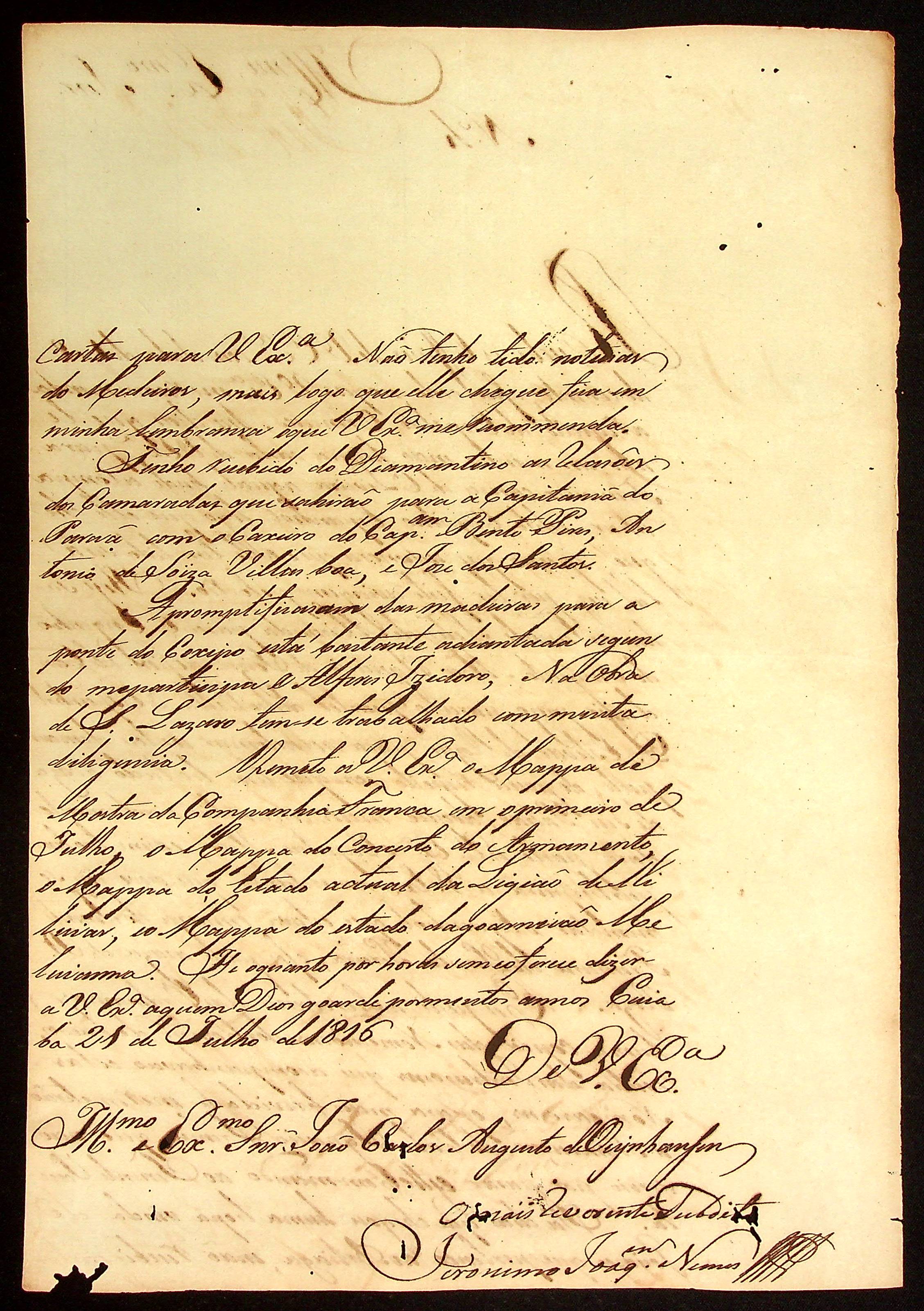CARTA de Jerônimo Joaquim Nunes ao [Governador e Capitão-General da Capitania de Mato Grosso] João Carlos Augusto d’Oeynhausen e Gravenberg.