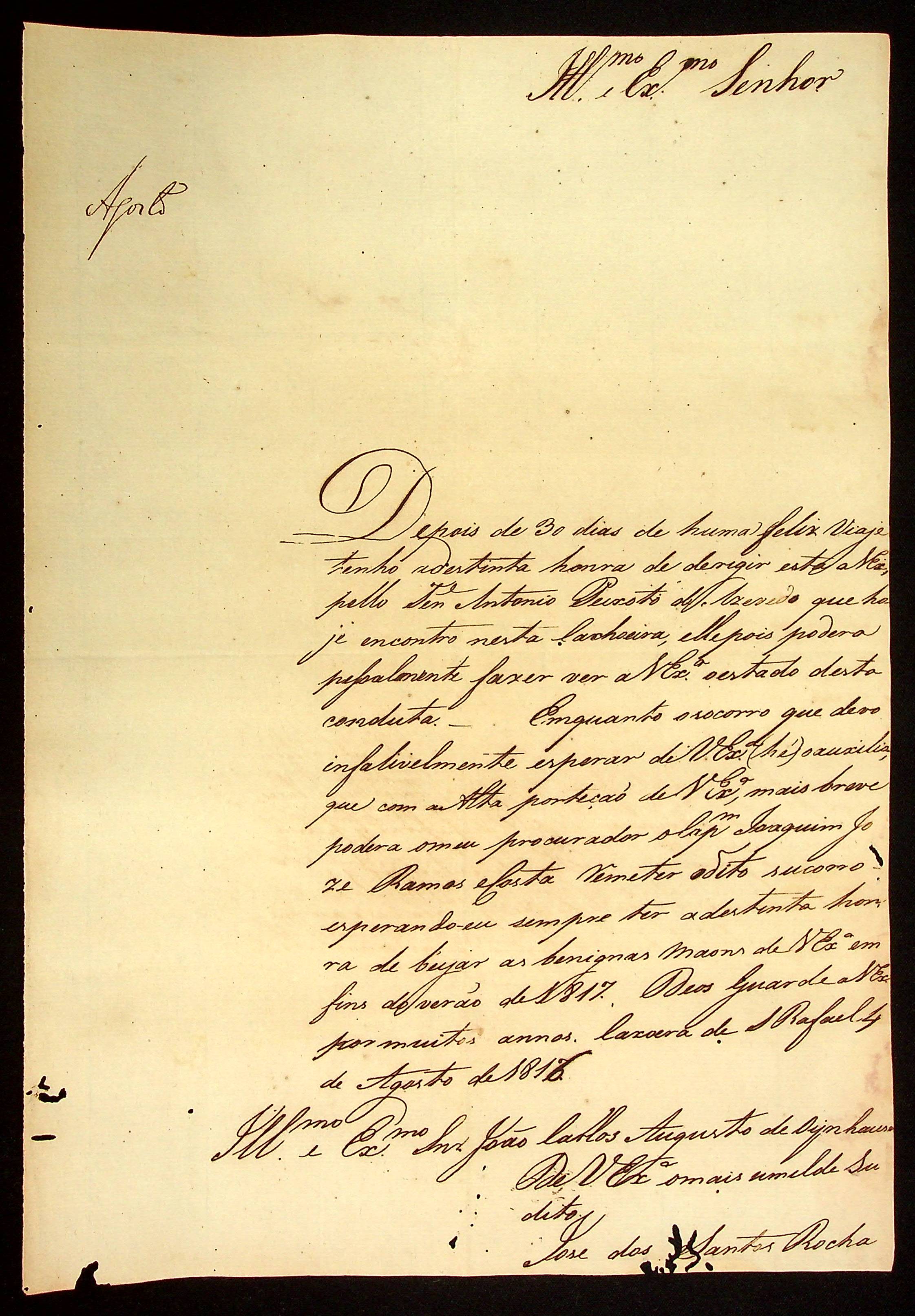 CARTA de José dos Santos Rocha ao [Governador e Capitão-General da Capitania de Mato Grosso] João Carlos Augusto d’Oeynhausen e Gravenberg.