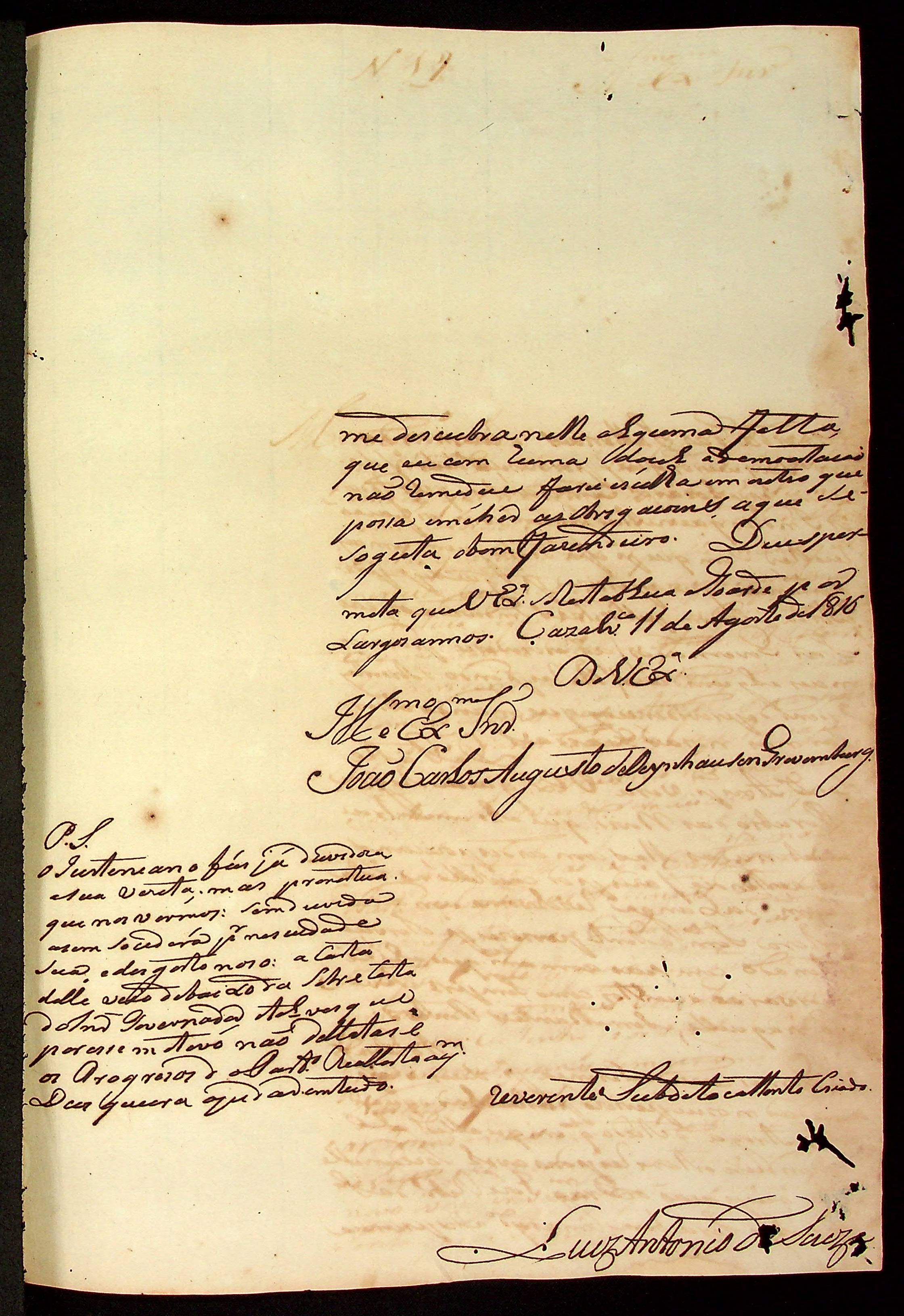 CARTA do [Alferes Comandante] Luiz Antônio de Souza ao [Governador e Capitão-General da Capitania de Mato Grosso] João Carlos Augusto d’Oeynhausen e Gravenberg.