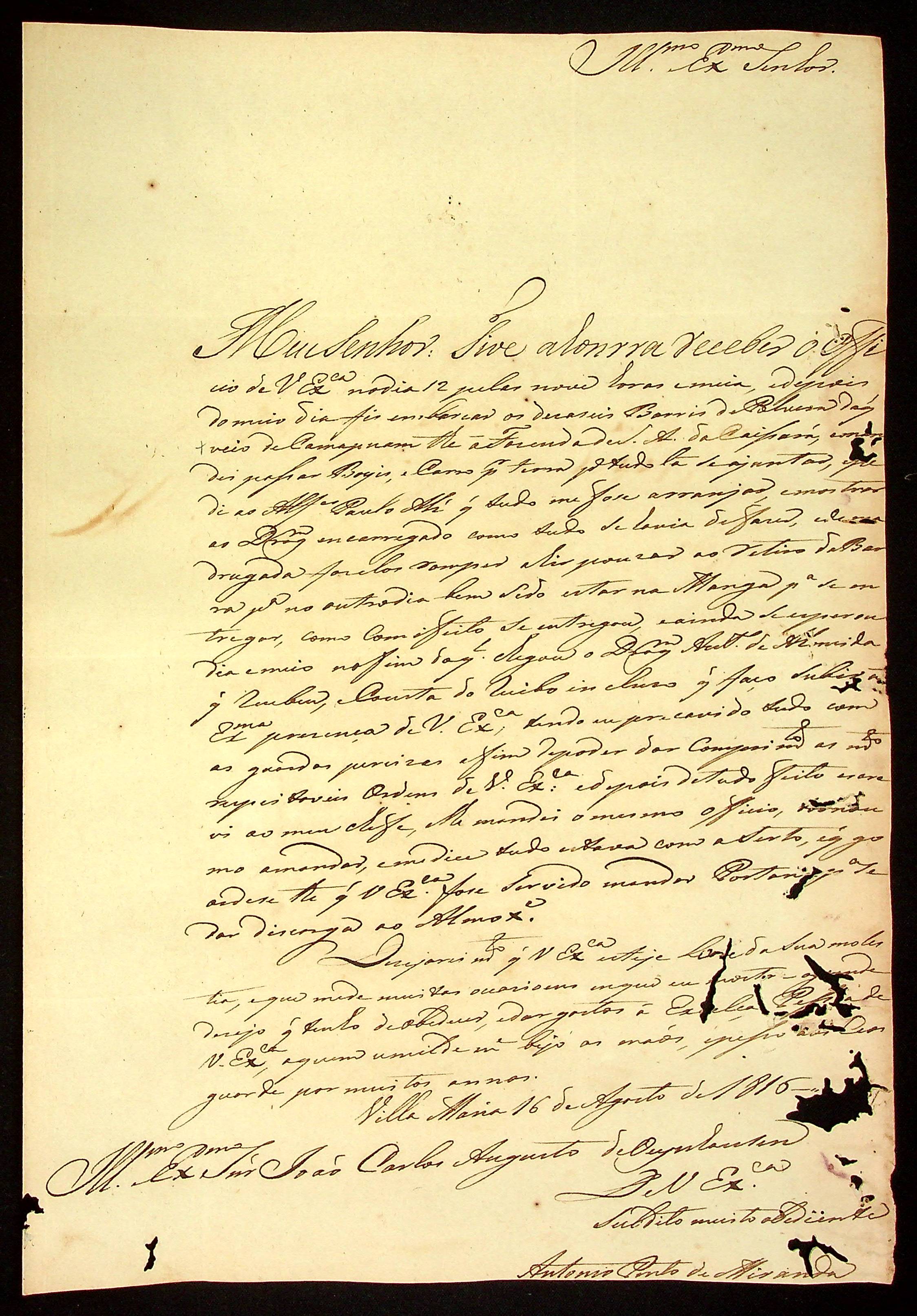 CARTA do [Capitão] Antônio Pinto de Miranda ao [Governador e Capitão-General da Capitania de Mato Grosso] João Carlos Augusto d’Oeynhausen e Gravenberg.