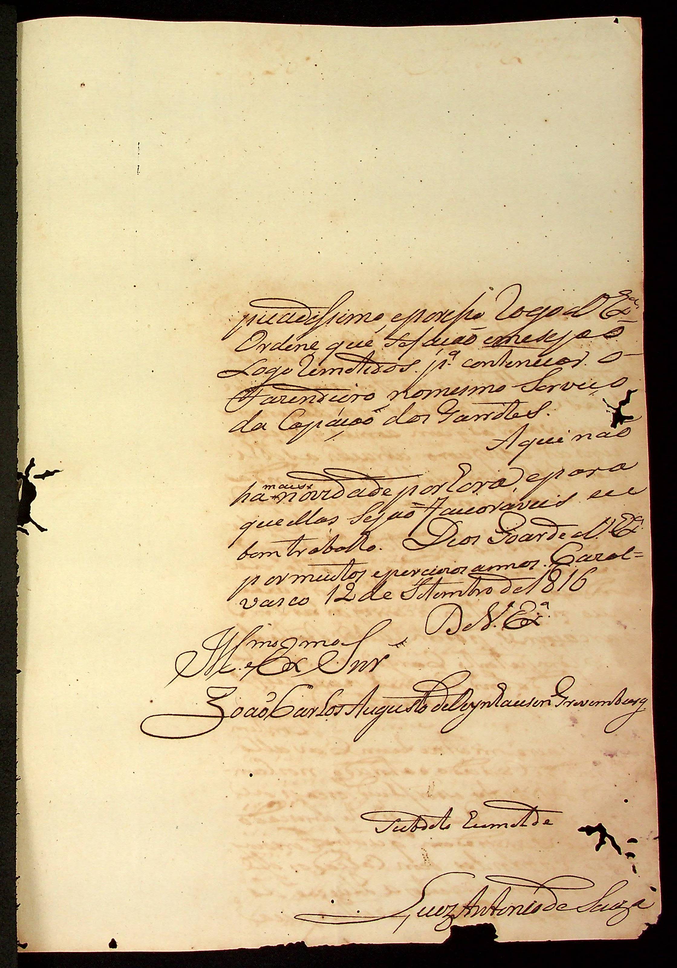 CARTA do [Alferes Comandante] Luiz Antônio de Souza ao [Governador e Capitão-General da Capitania de Mato Grosso] João Carlos Augusto d’Oeynhausen e Gravenberg.