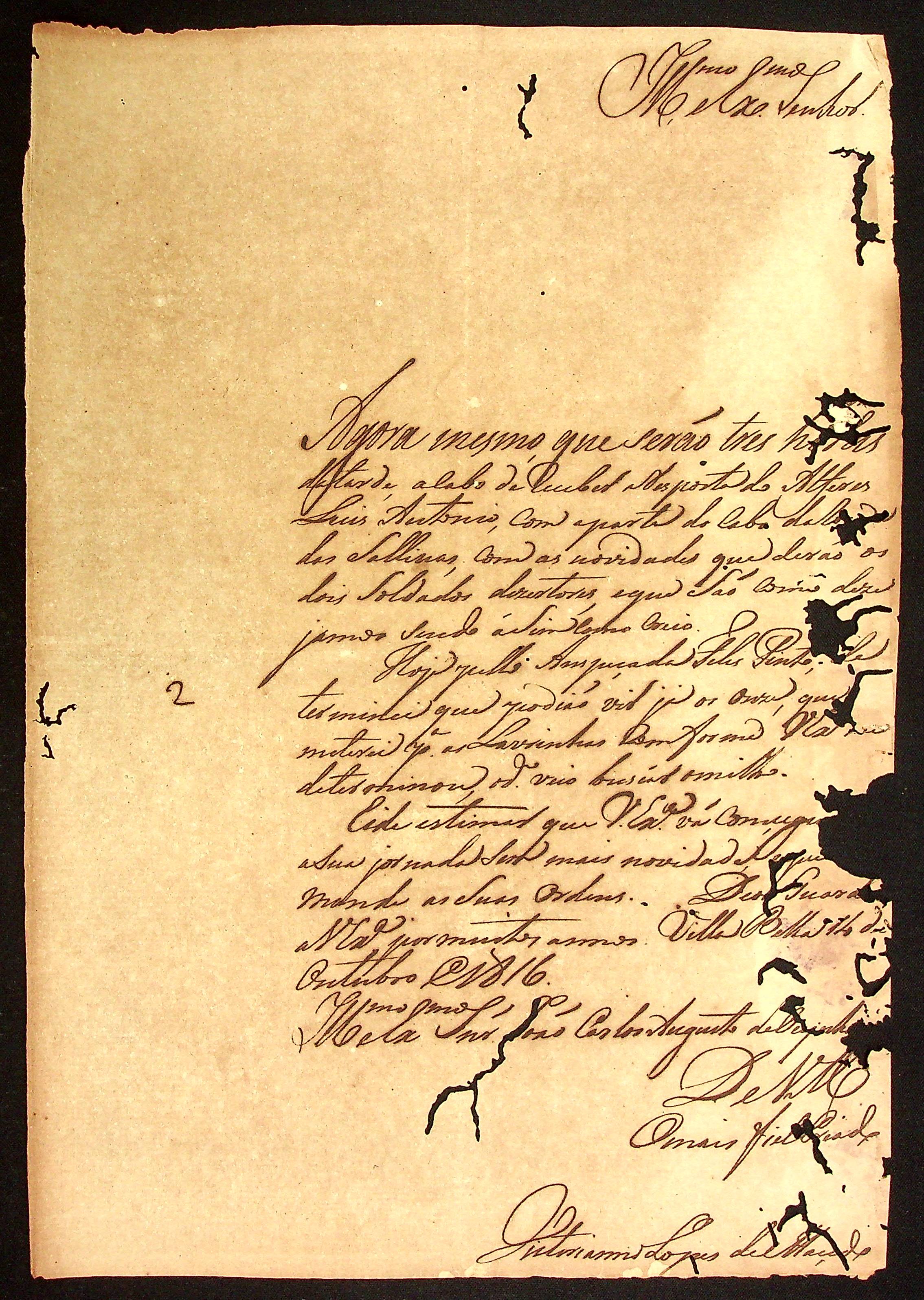CARTA do [Coronel] Victoriano Lopes de Macedo ao [Governador e Capitão-General da Capitania de Mato Grosso] João Carlos Augusto d’Oeynhausen e Gravenberg.