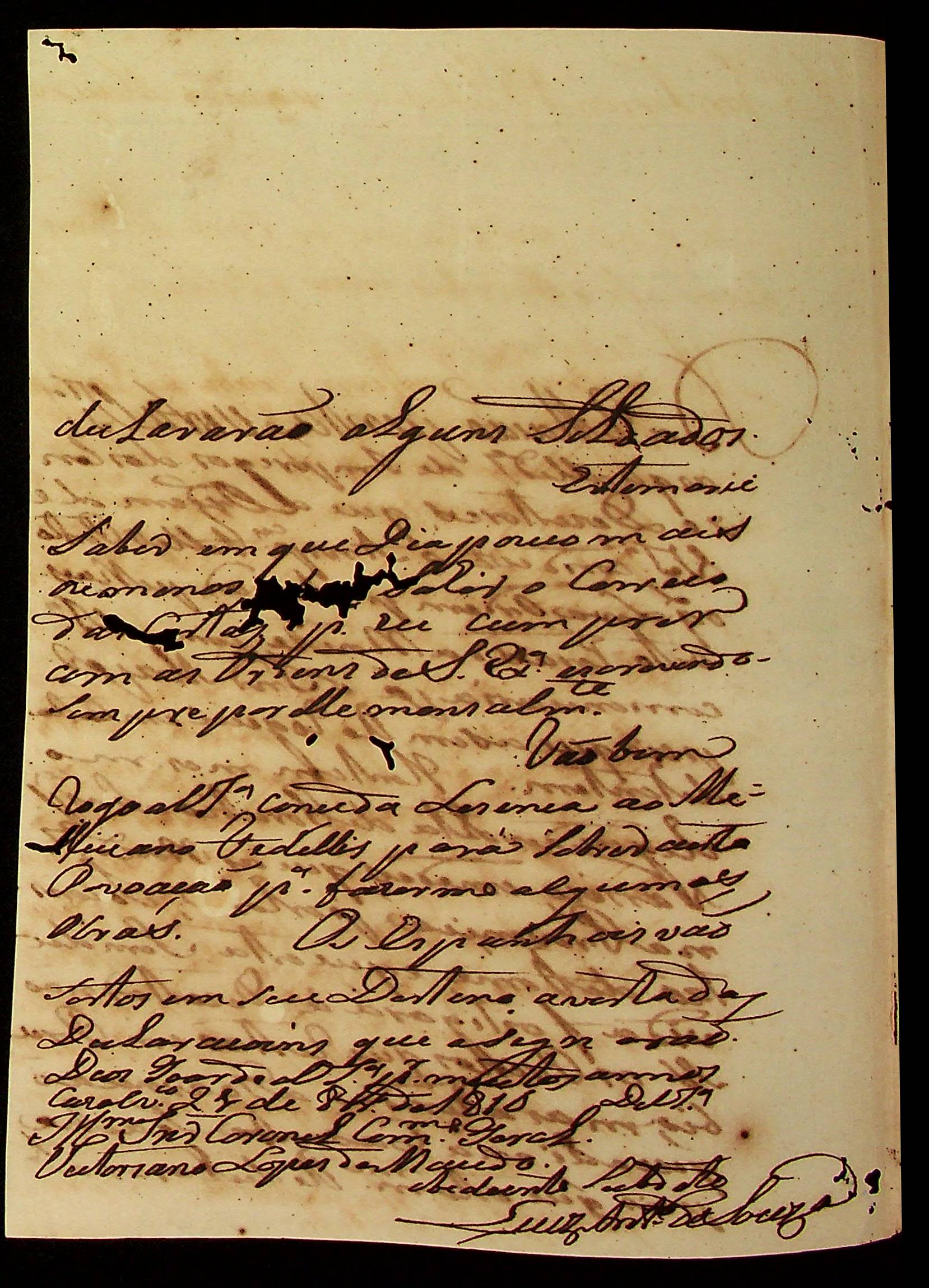 CARTA do [Alferes Comandante] Luiz Antônio de Souza ao [Coronel Comandante Geral] Victoriano Lopes de Macedo.
