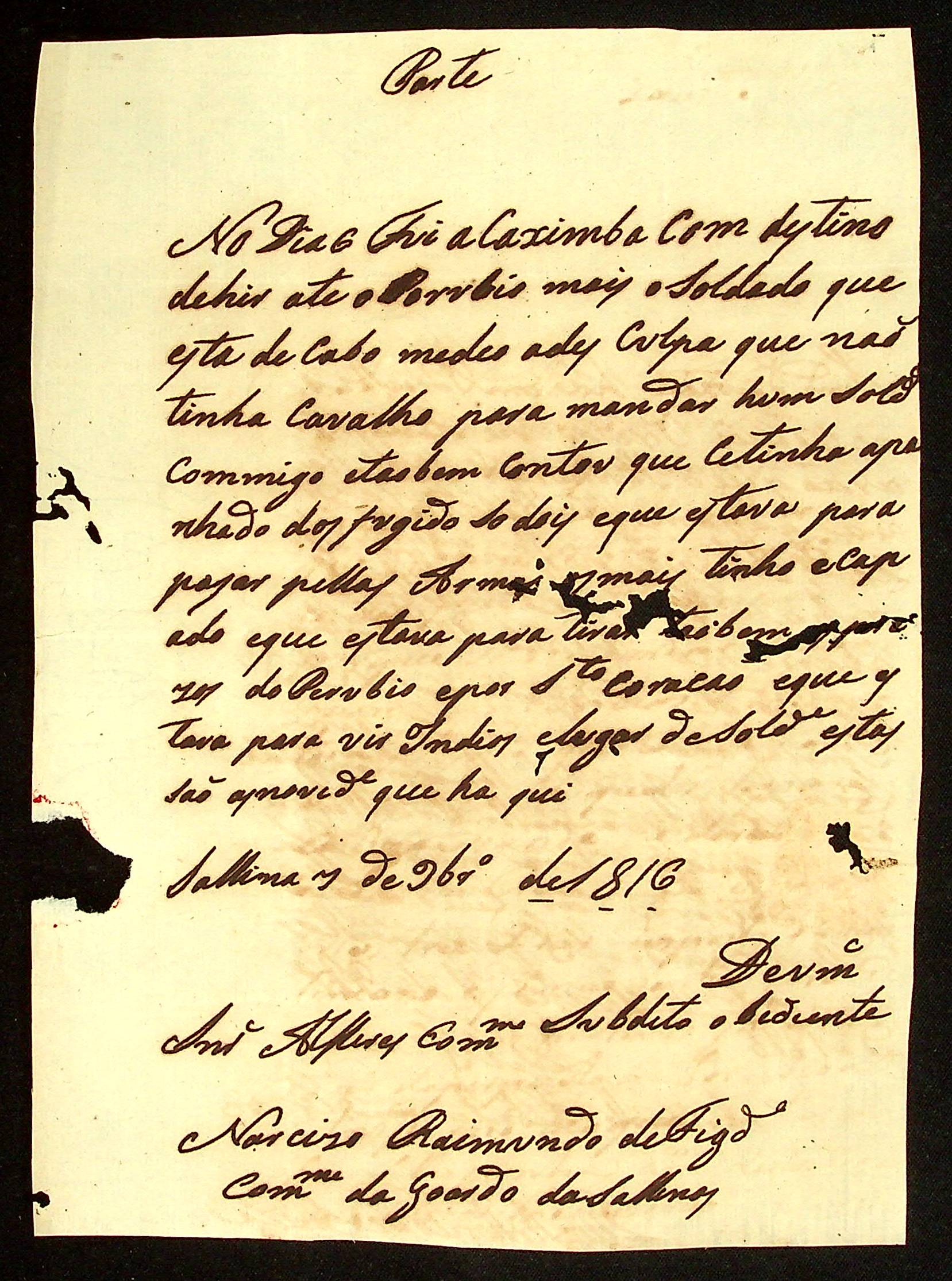 CARTA do Comandante da Guarda das Salinas Narciso Raimundo de Figueiredo ao Alferes Comandante […].
