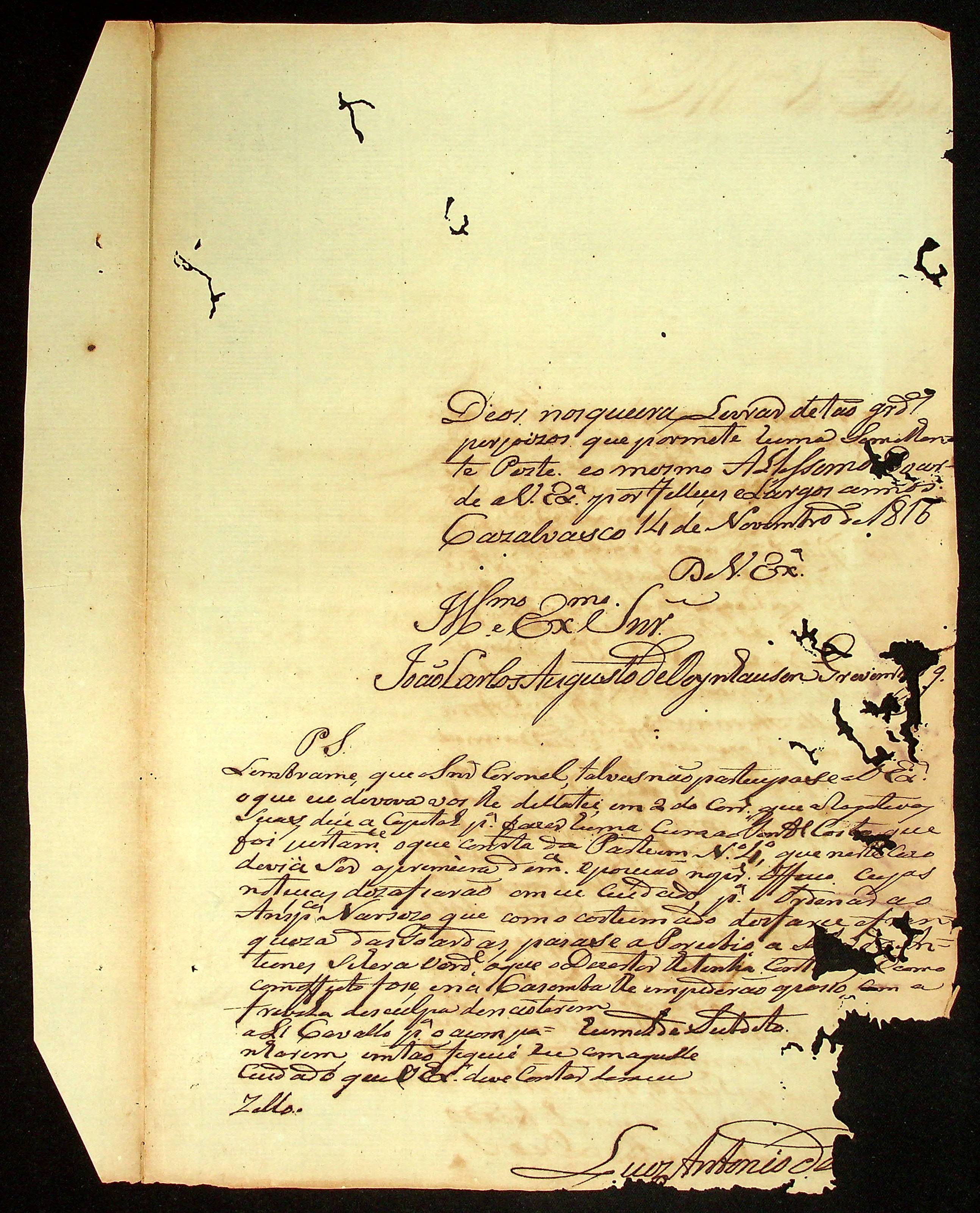 CARTA do [Alferes Comandante] Luiz Antônio de Souza ao [Governador e Capitão-General da Capitania de Mato Grosso] João Carlos Augusto d’Oeynhausen e Gravenberg.
