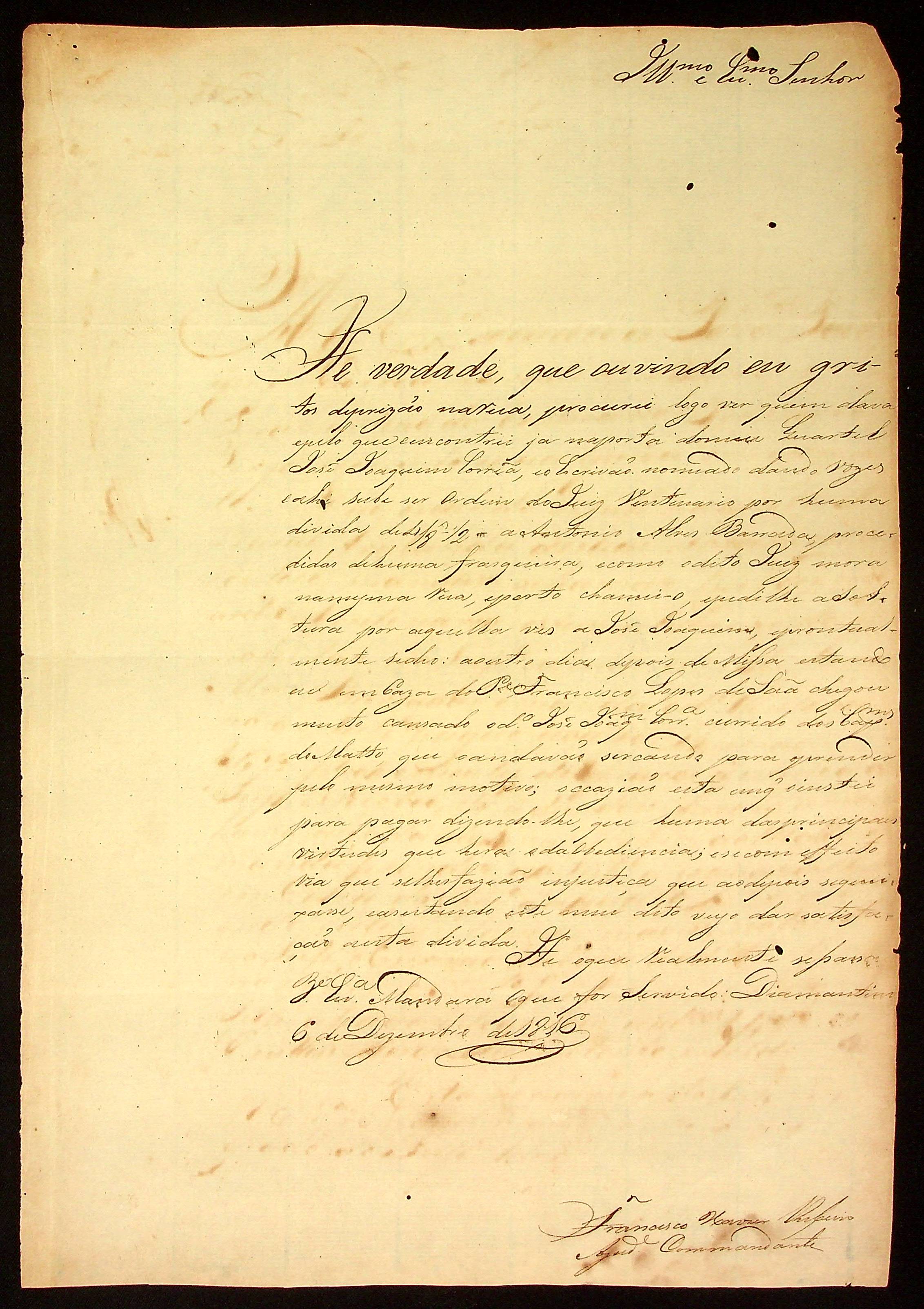 CARTA do Ajudante e Comandante Francisco Xavier Ribeiro ao [Governador e Capitão-General da Capitania de Mato Grosso] João Carlos Augusto d’Oeynhausen e Gravenberg.