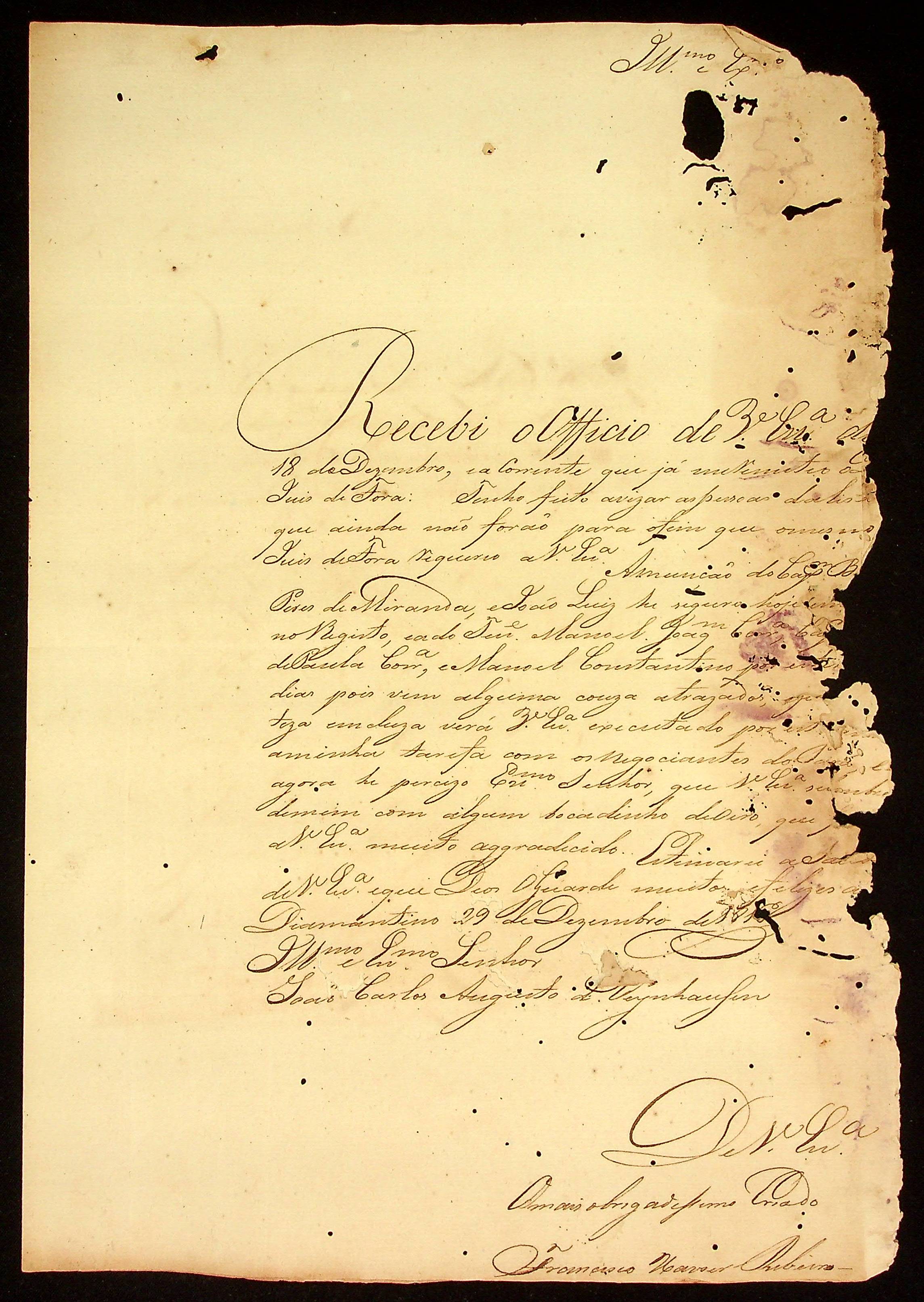 CARTA do [Capitão Comandante] Francisco Xavier Ribeiro ao [Governador e Capitão-General da Capitania de Mato Grosso] João Carlos Augusto d’Oeynhausen e Gravenberg.