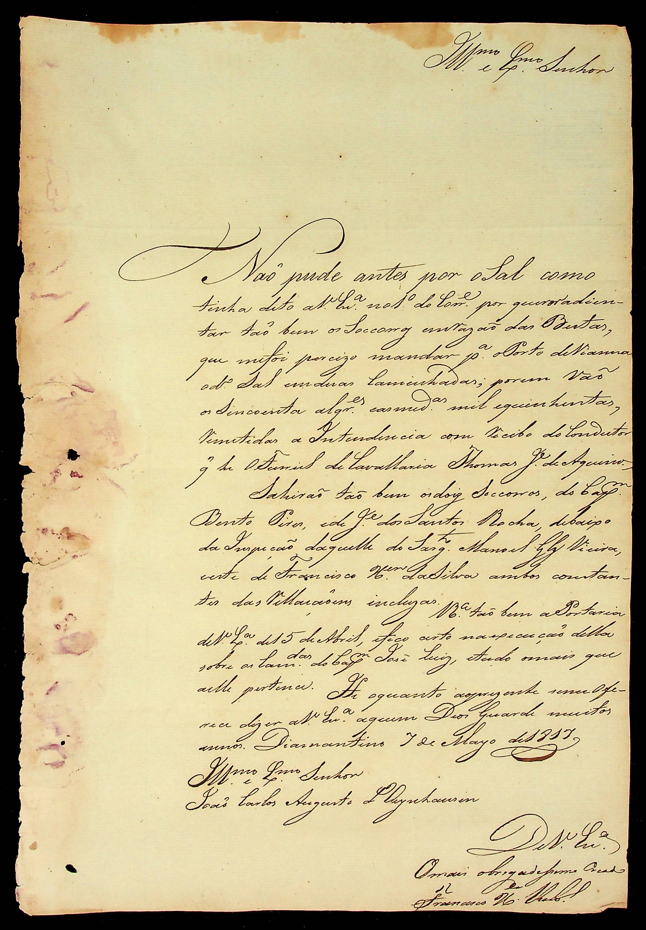 CARTA do [Comandante] Francisco Xavier Ribeiro ao [Governador e Capitão-General da Capitania de Mato Grosso] João Carlos Augusto d’Oeynhausen e Gravenberg.