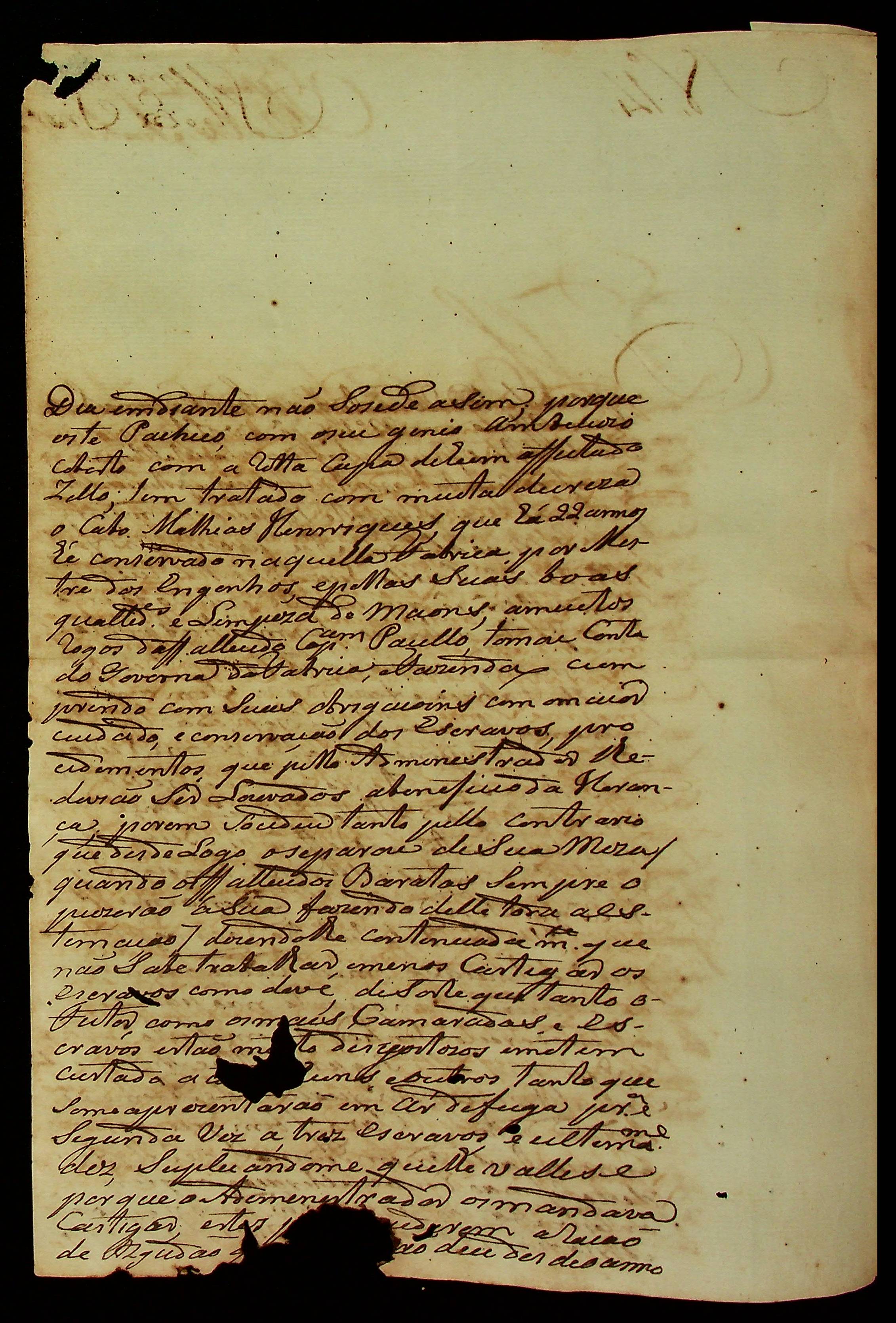 CARTA do Alferes Comandante Luís Antônio de Sousa ao [Governador e Capitão-General da Capitania de Mato Grosso] João Carlos Augusto d’Oeynhausen e Gravenberg.