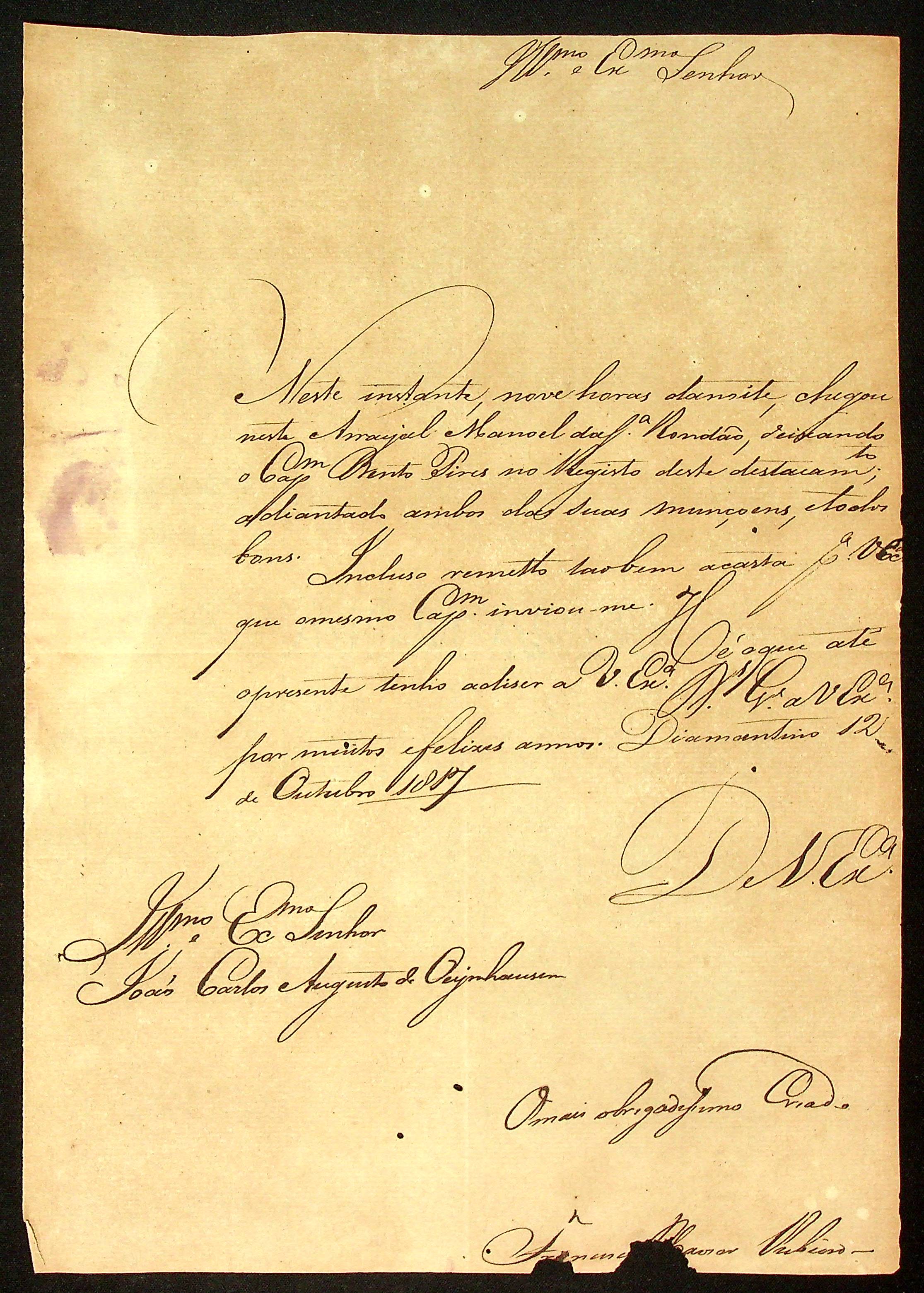 CARTA do [Comandante] Francisco Xavier Ribeiro ao [Governador e Capitão-General da Capitania de Mato Grosso] João Carlos Augusto d’Oeynhausen e Gravenberg.
