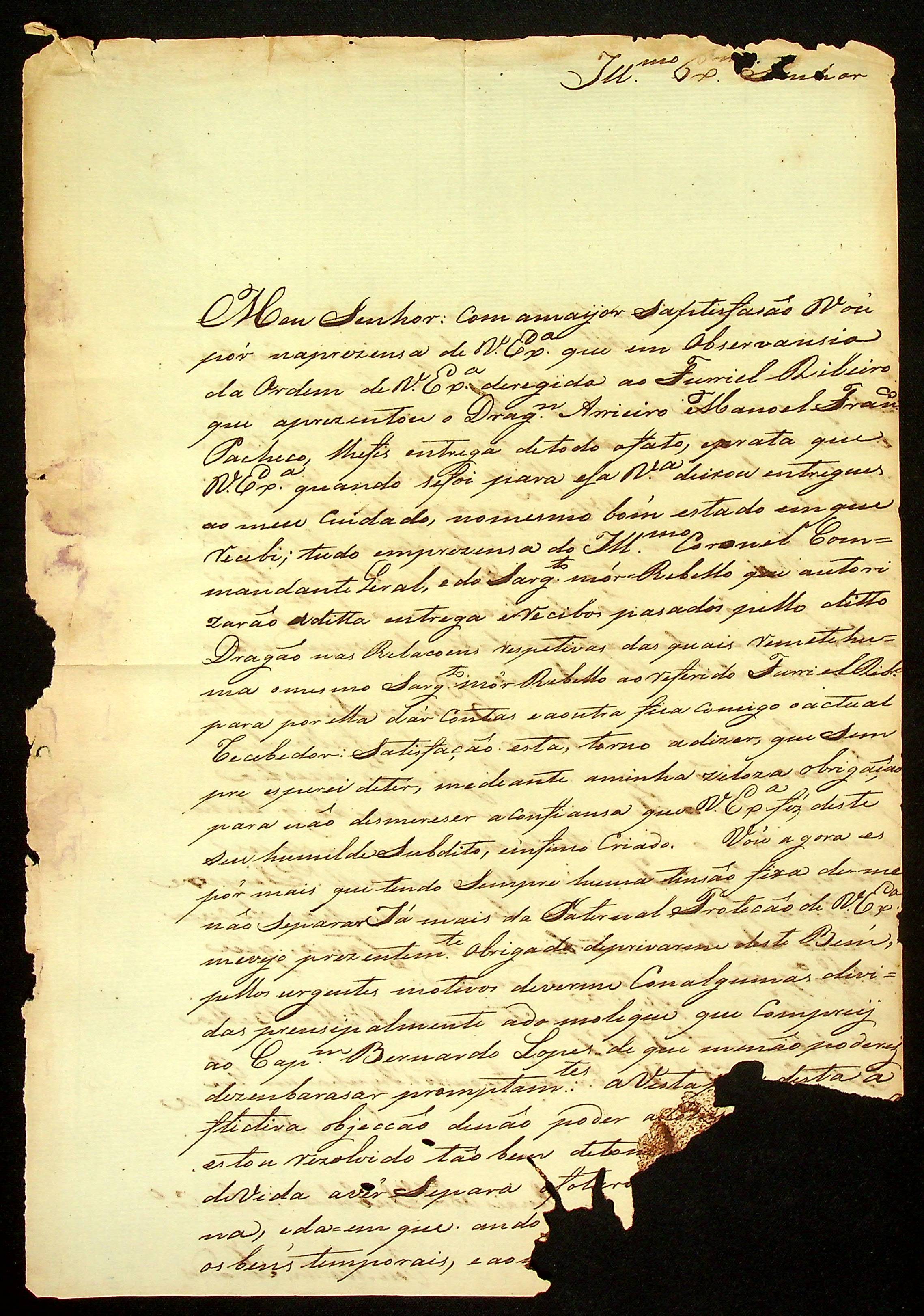 CARTA de José Martins Fernandes ao [Governador e Capitão-General da Capitania de Mato Grosso] João Carlos Augusto d’Oeynhausen e Gravenberg.