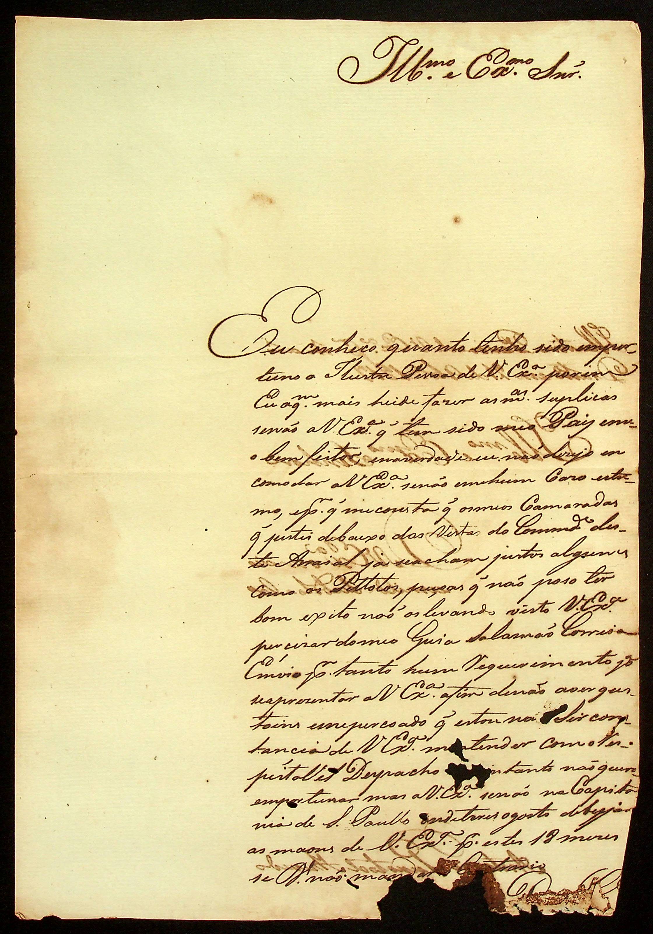 CARTA do Tenente Antônio Peixoto ao [Governador e Capitão-General da Capitania de Mato Grosso] João Carlos Augusto d’Oeynhausen e Gravenberg.