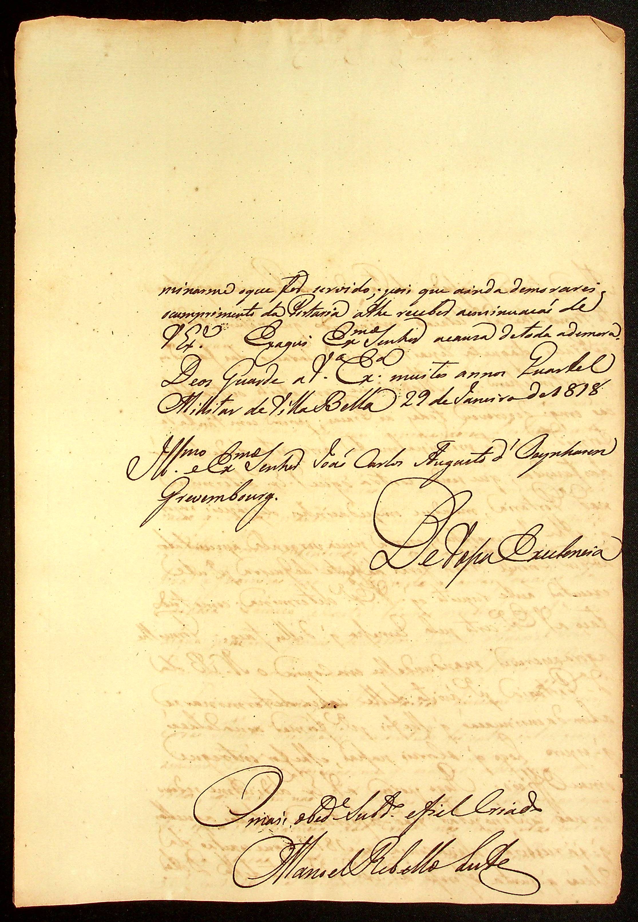 CARTA do [Sargento-mor] Manoel Rebelo Leite ao [Governador e Capitão-General da Capitania de Mato Grosso] João Carlos Augusto d’Oeynhausen e Gravenberg.