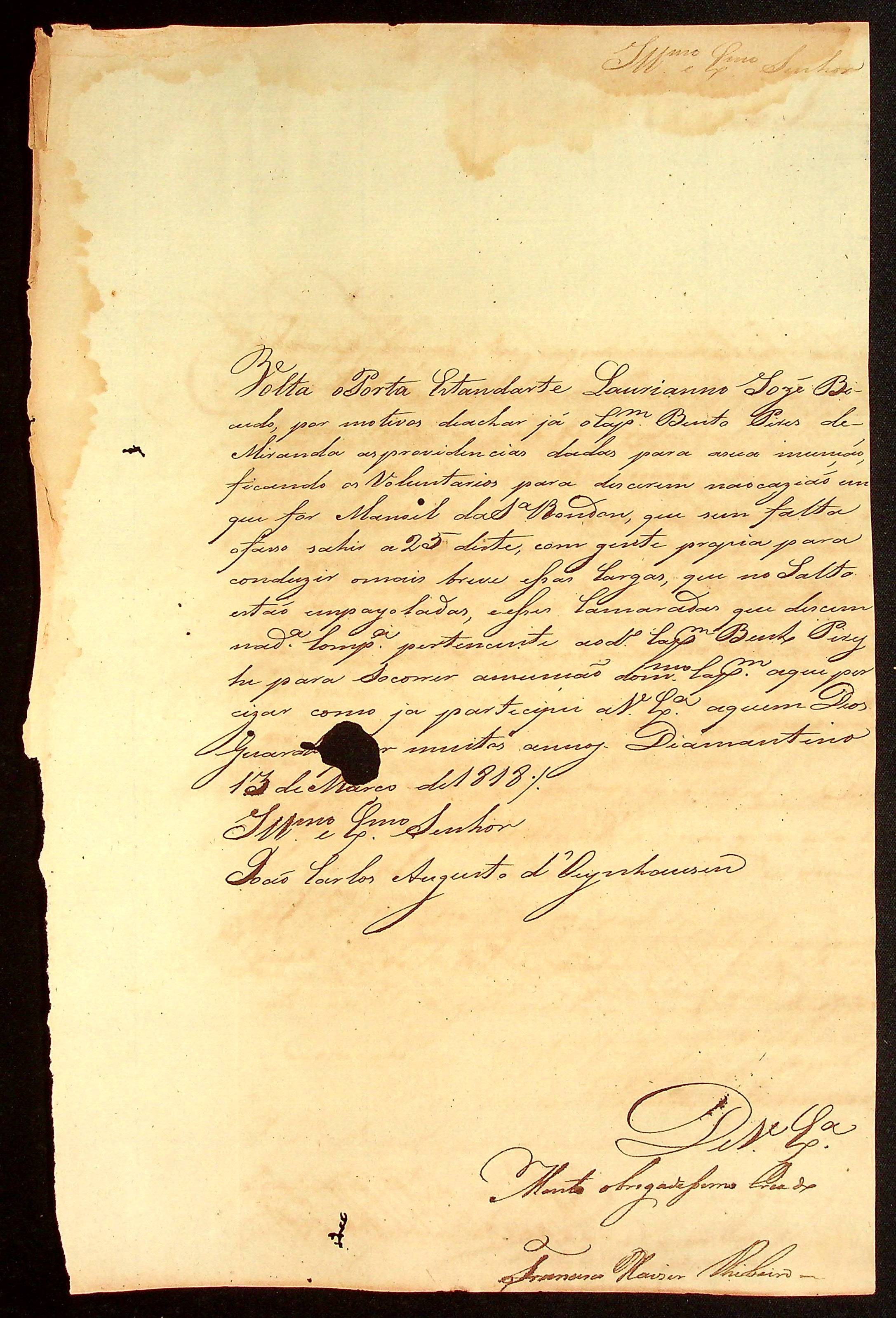 CARTA de Francisco Xavier Ribeiro ao [Governador e Capitão-General da Capitania de Mato Grosso] João Carlos Augusto d’Oeynhausen e Gravenberg.