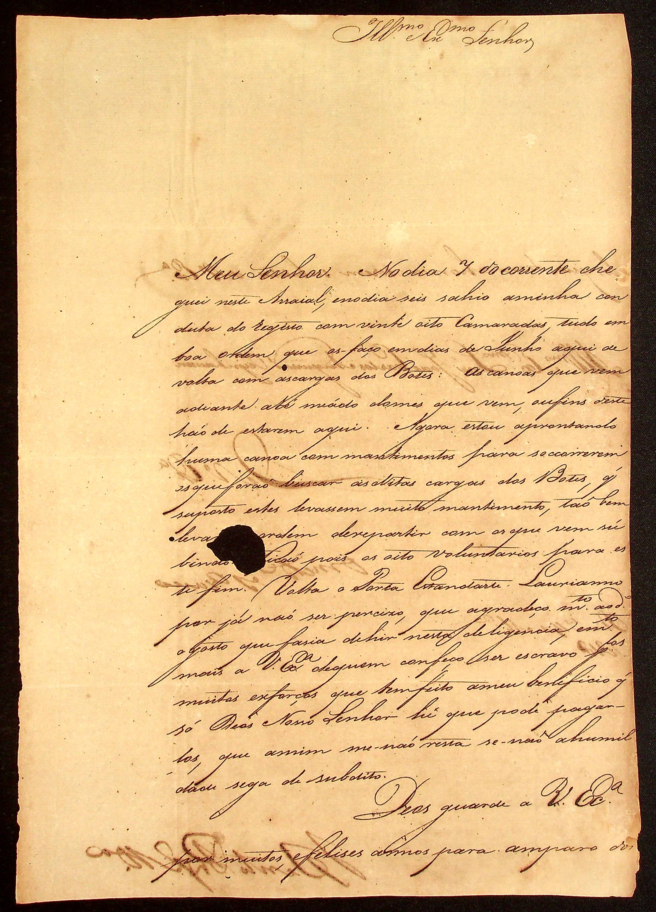 CARTA de Bento Pires de Miranda ao [Governador e Capitão-General da Capitania de Mato Grosso] João Carlos Augusto d’Oeynhausen e Gravenberg.