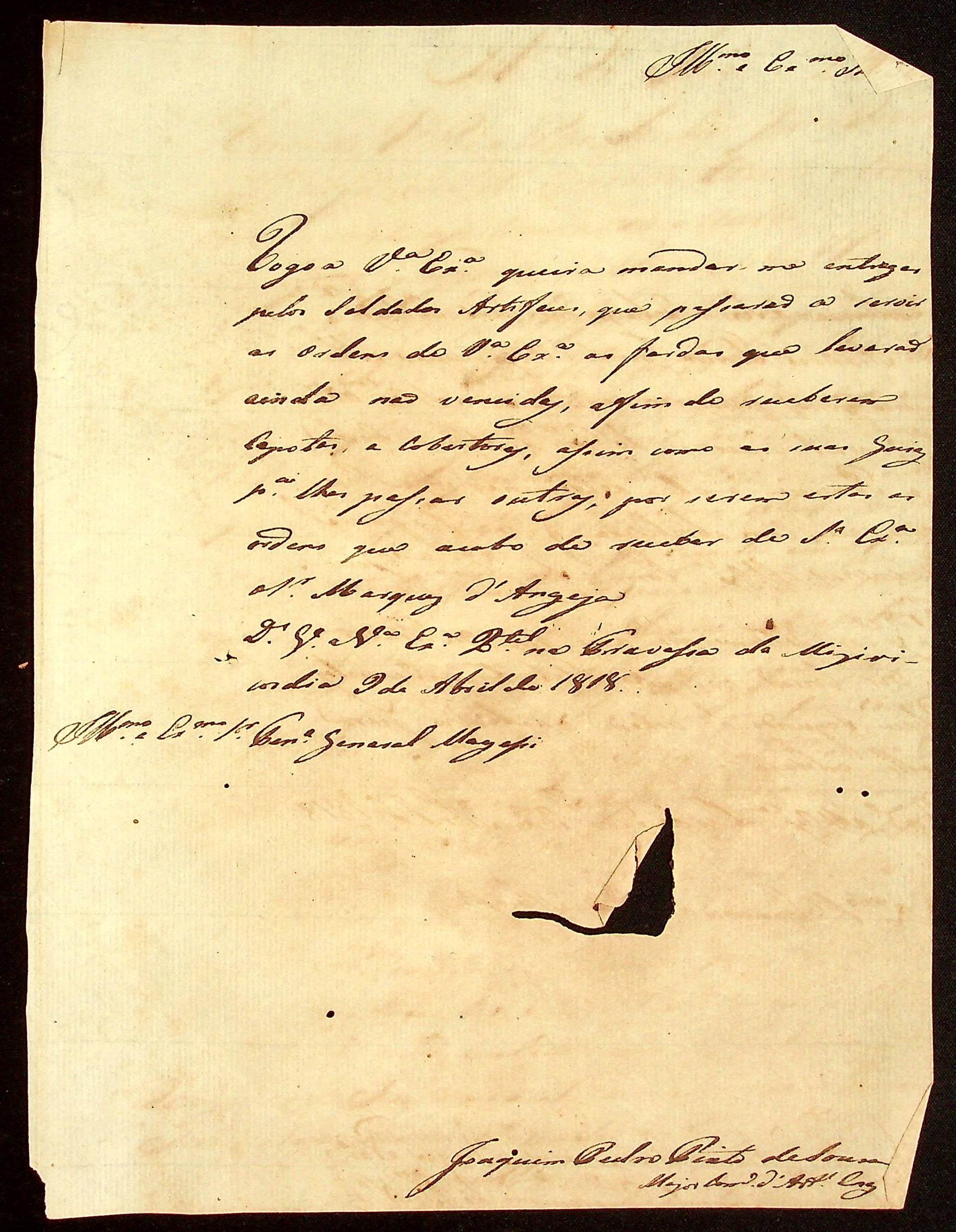 CARTA do Major e Comandante da Artilharia Joaquim Pedro Pinto de Souza ao Tenente General Francisco de Paula Maggessi Tavares Carvalho.