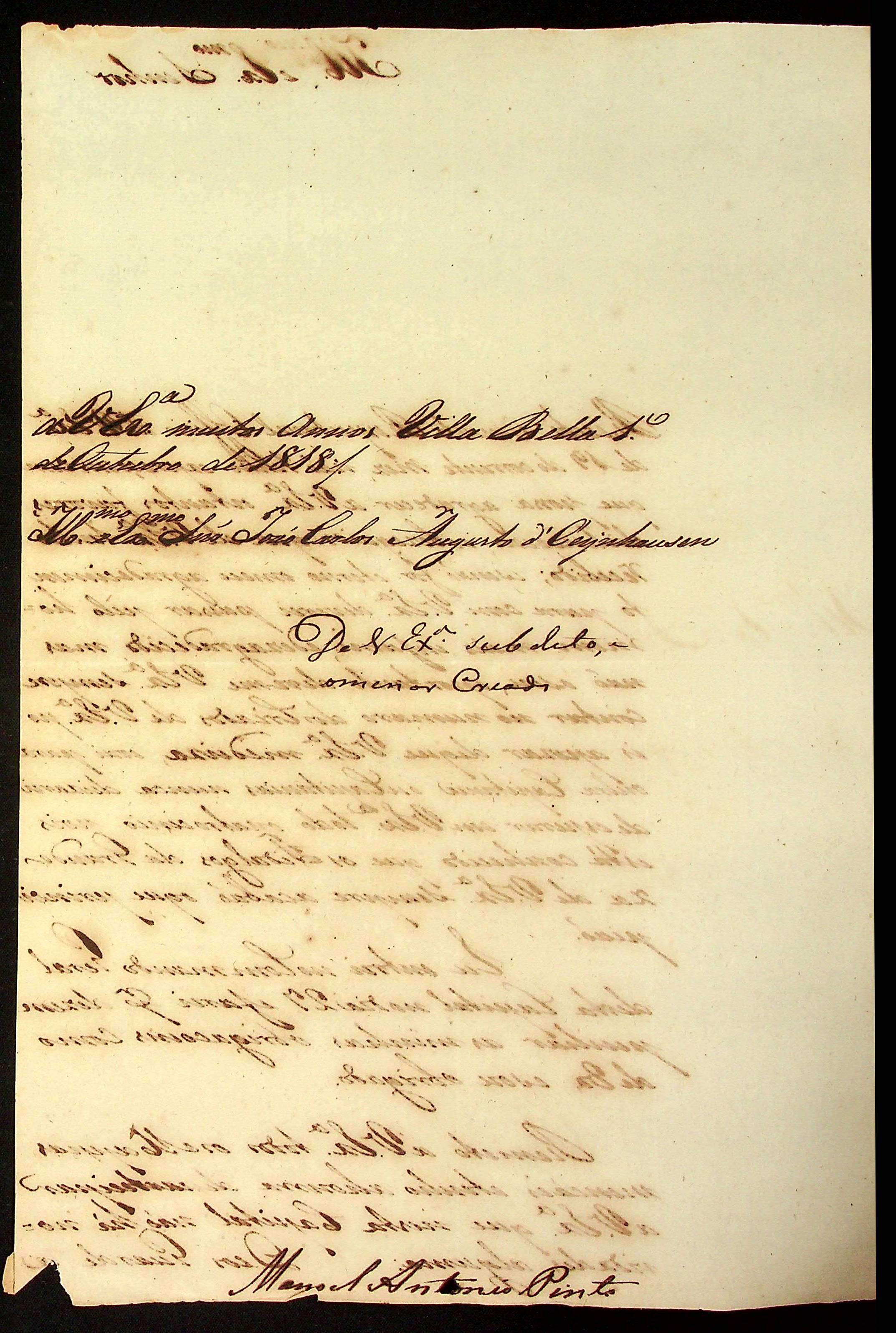 CARTA do [Comandante Geral da capital] Manoel Antônio Pinto ao Governador e Capitão-General da Capitania de Mato Grosso João Carlos Augusto d’Oeynhausen e Gravenberg.
