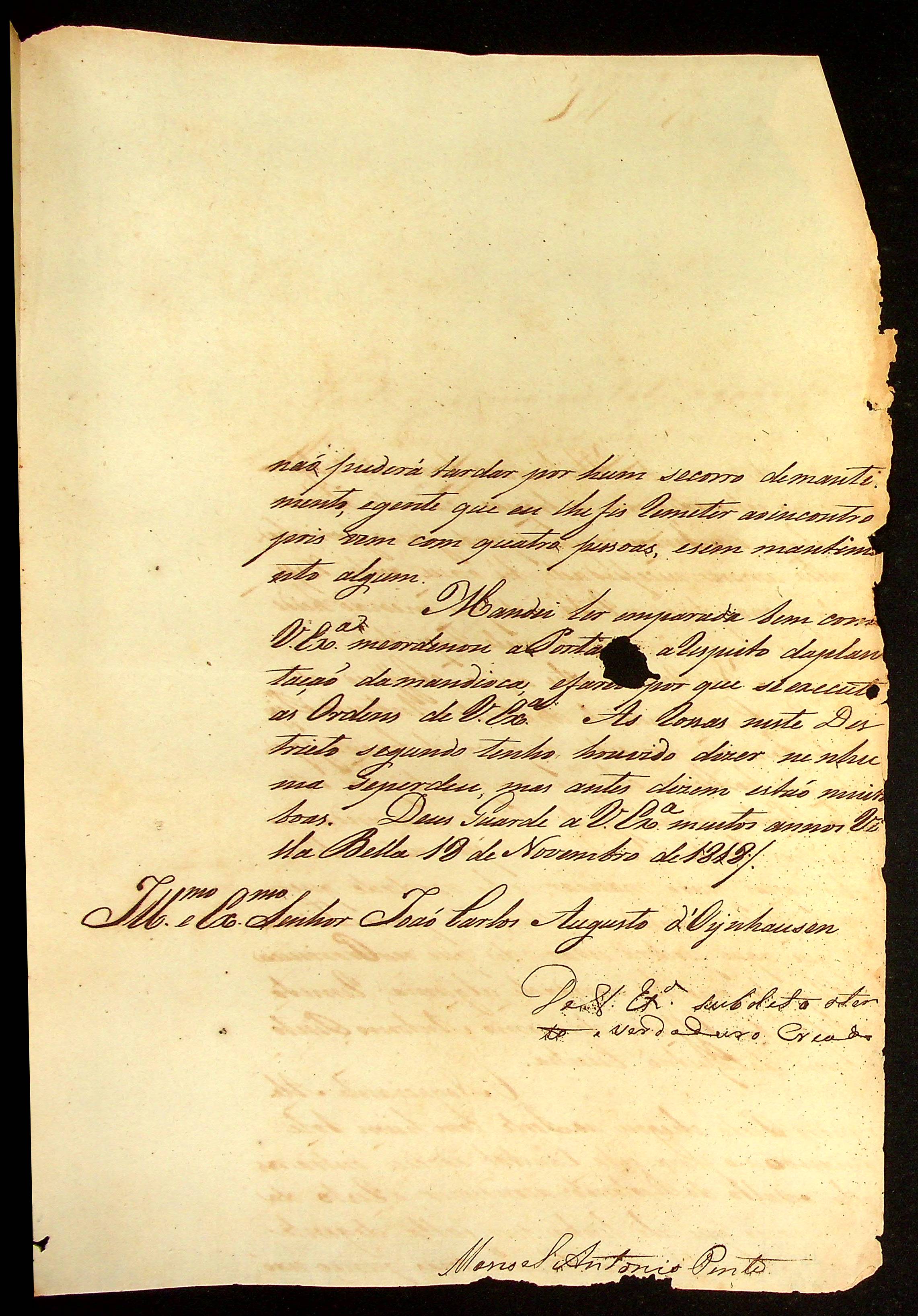 CARTA de Manoel Antônio Pinto ao [Governador e Capitão-General da Capitania de Mato Grosso] João Carlos Augusto d’Oeynhausen e Gravenberg.