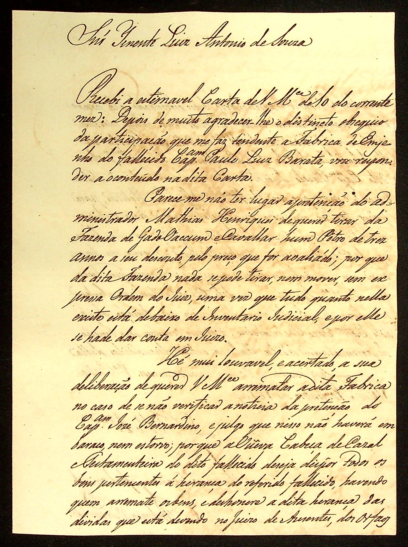CARTA do Tenente Luís Antônio de Sousa ao [Governador e Capitão-General da Capitania de Mato Grosso] João Carlos Augusto d’Oeynhausen e Gravenberg.
