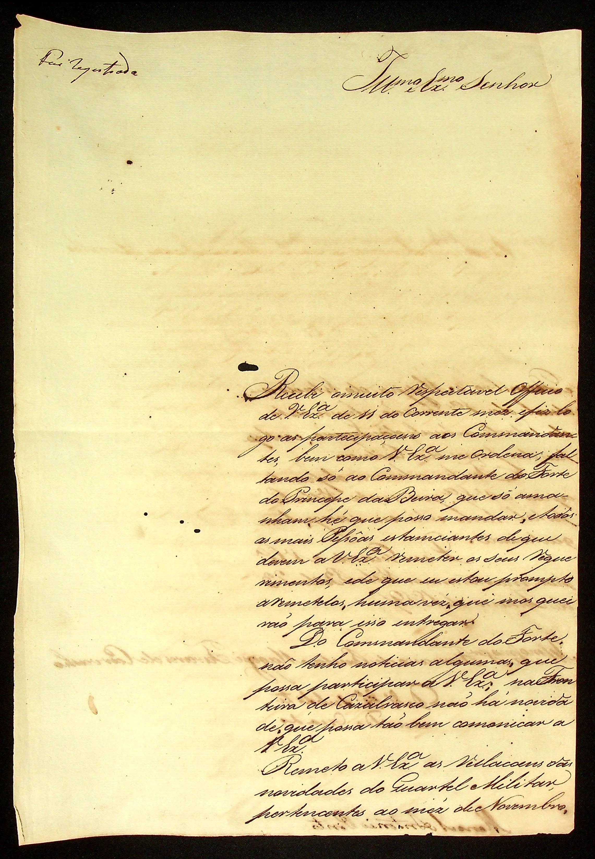CARTA de Manoel Antônio Pinto ao [Governador e Capitão-General da Capitania de Mato Grosso] Francisco de Paula Maggessi Tavares de Carvalho.