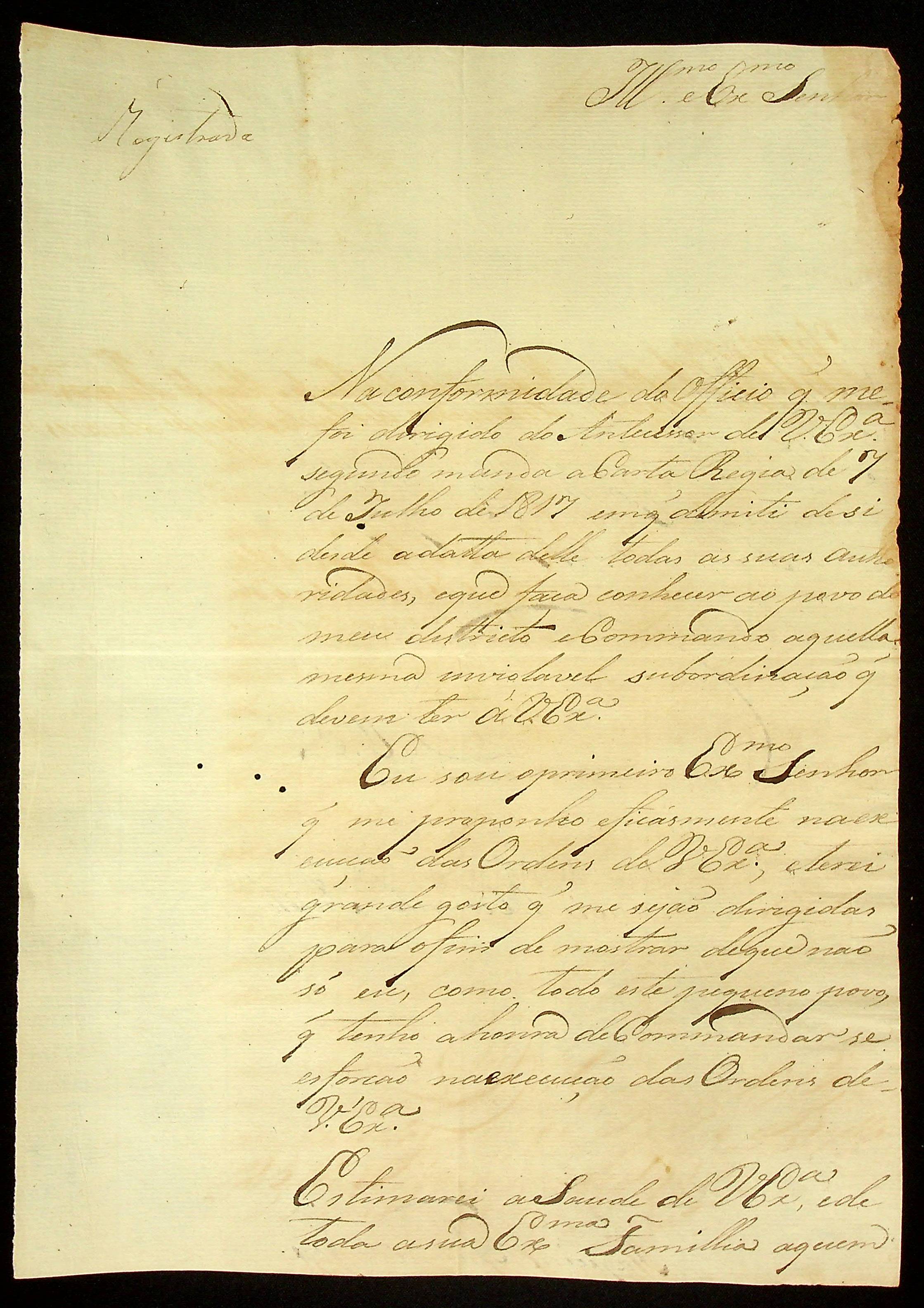 CARTA de Joaquim Antônio de Gois ao [Governador e Capitão-General da Capitania de Mato Grosso Francisco de Paula Maggessi Tavares de Carvalho].