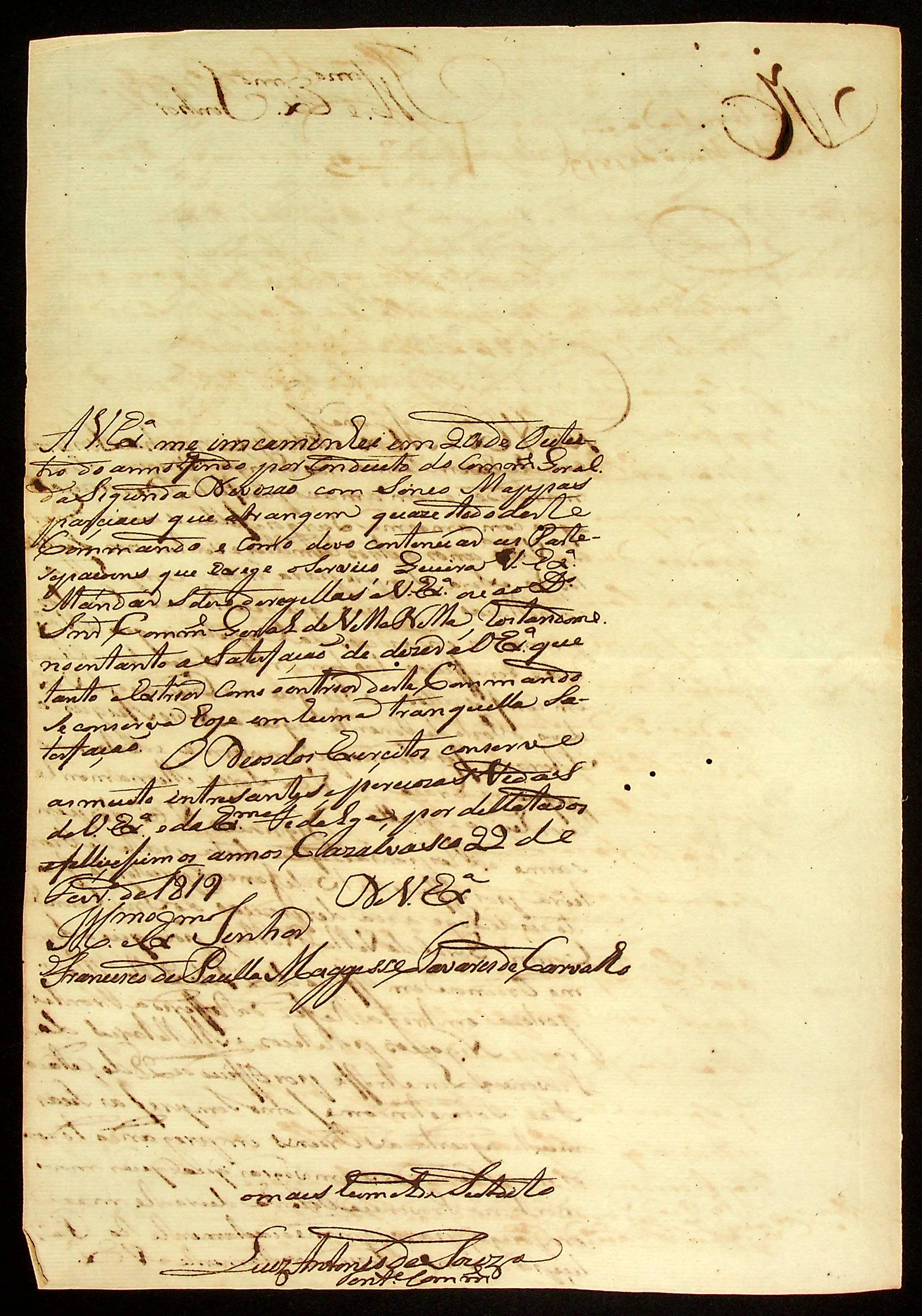 CARTA do Tenente Comandante Luís Antônio de Souza ao [Governador e Capitão-General da Capitania de Mato Grosso] Francisco de Paula Maggessi Tavares de Carvalho.