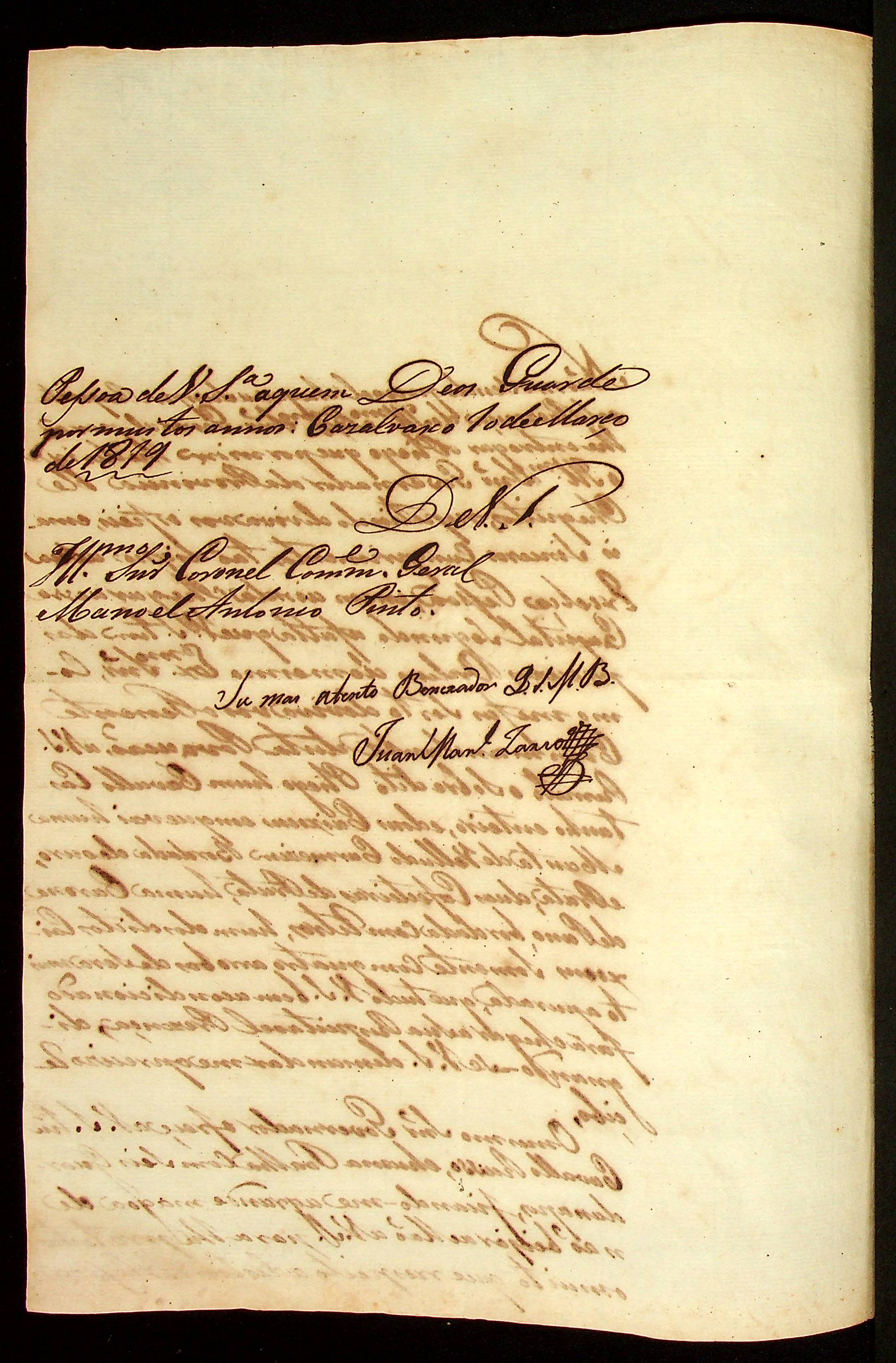 CARTA de [Juan Manoel Zarro] ao Coronel Comandante Geral Manoel Antônio Pinto.