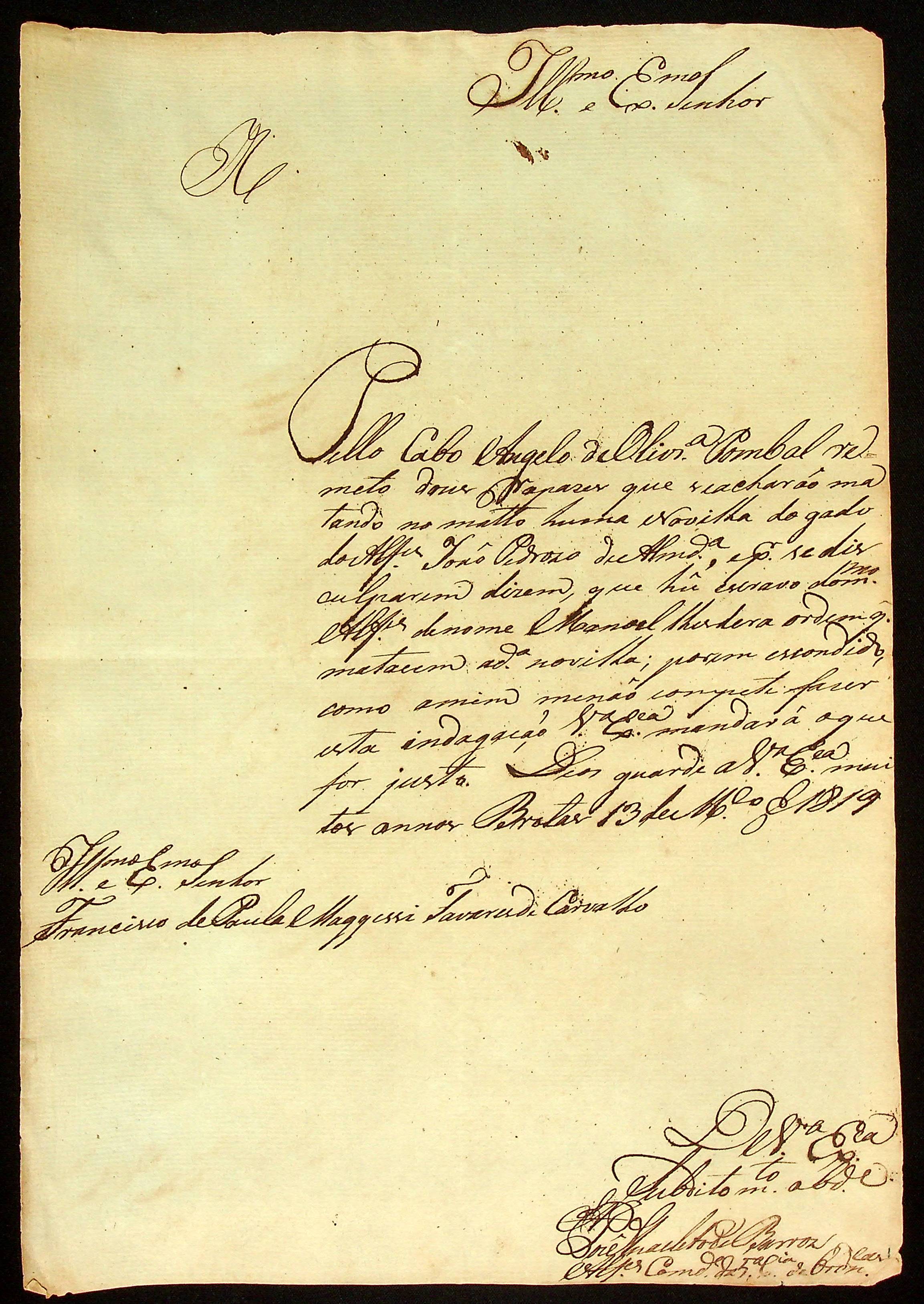 CARTA do Alferes Comandante da 5ª Companhia de Ordenanças José Anacleto de Barros ao [Governador e Capitão-General da Capitania de Mato Grosso] Francisco de Paula Maggessi Tavares de Carvalho.