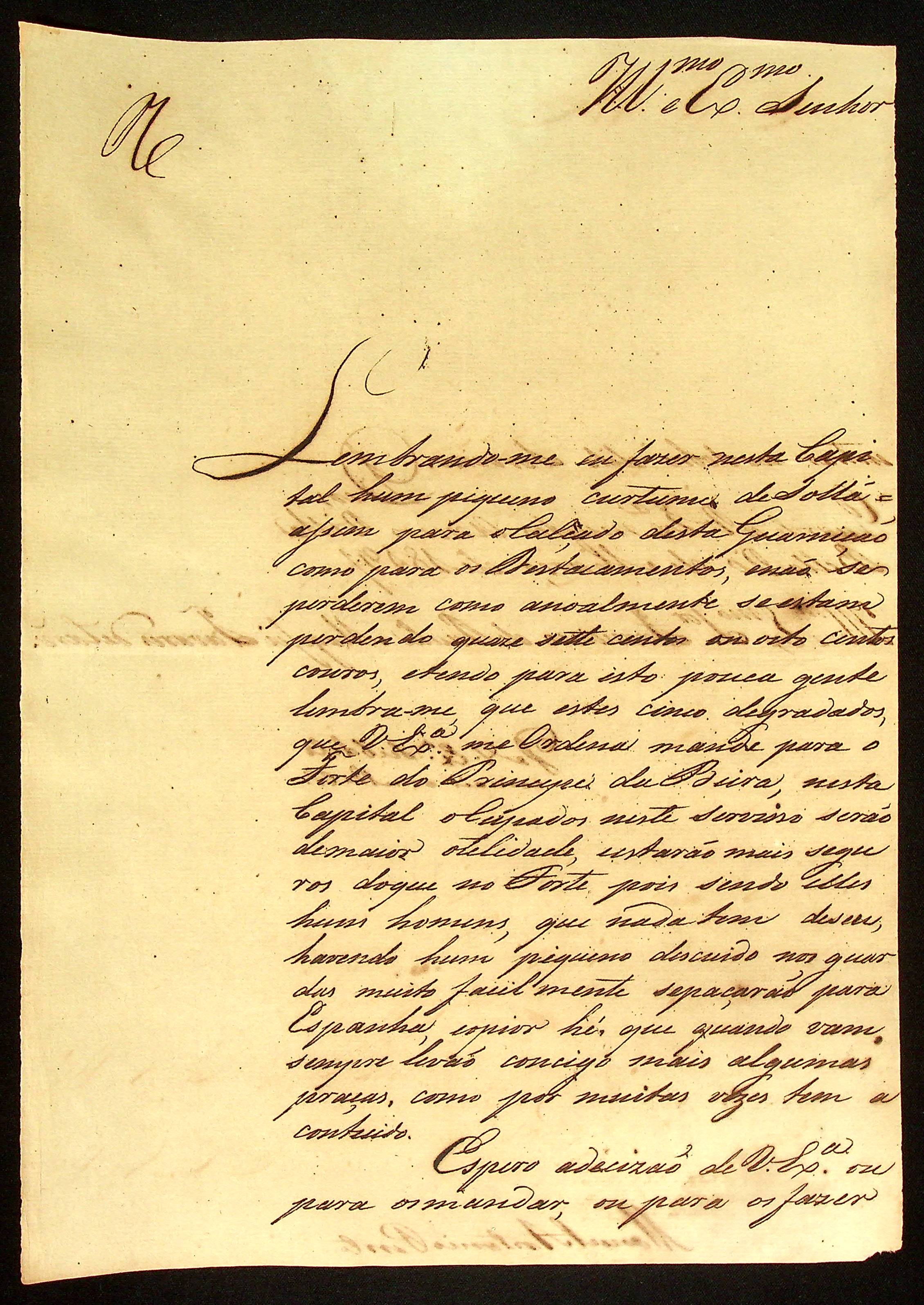 CARTA do [Tenente-Coronel] Manoel Antônio Pinto ao [Governador e Capitão-General da Capitania de Mato Grosso] Francisco de Paula Maggessi Tavares de Carvalho.