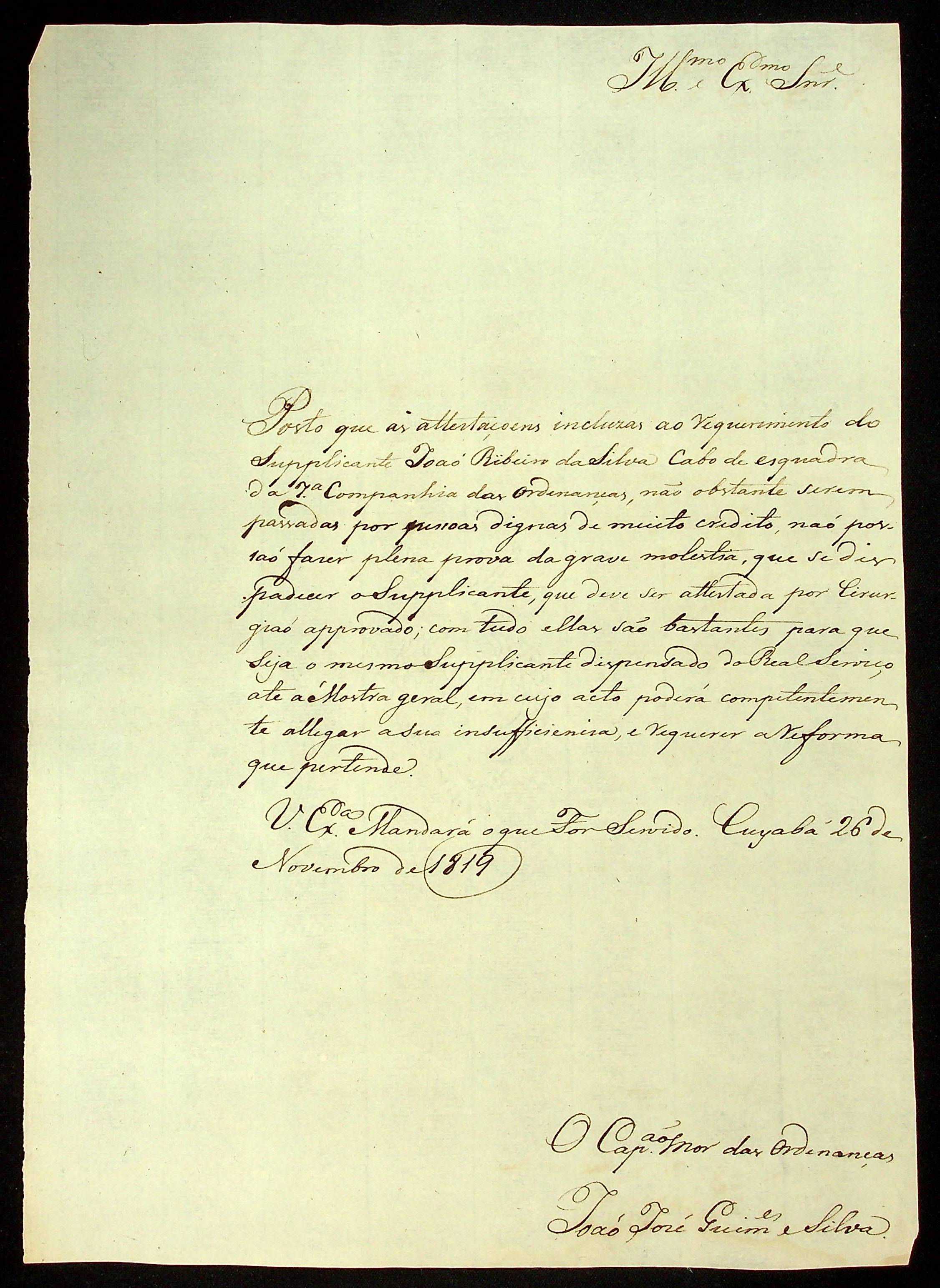 CARTA do Capitão-mor das Ordenanças João José Guimarães ao [Governador e Capitão-General da Capitania de Mato Grosso Francisco de Paula Maggessi Tavares de Carvalho].