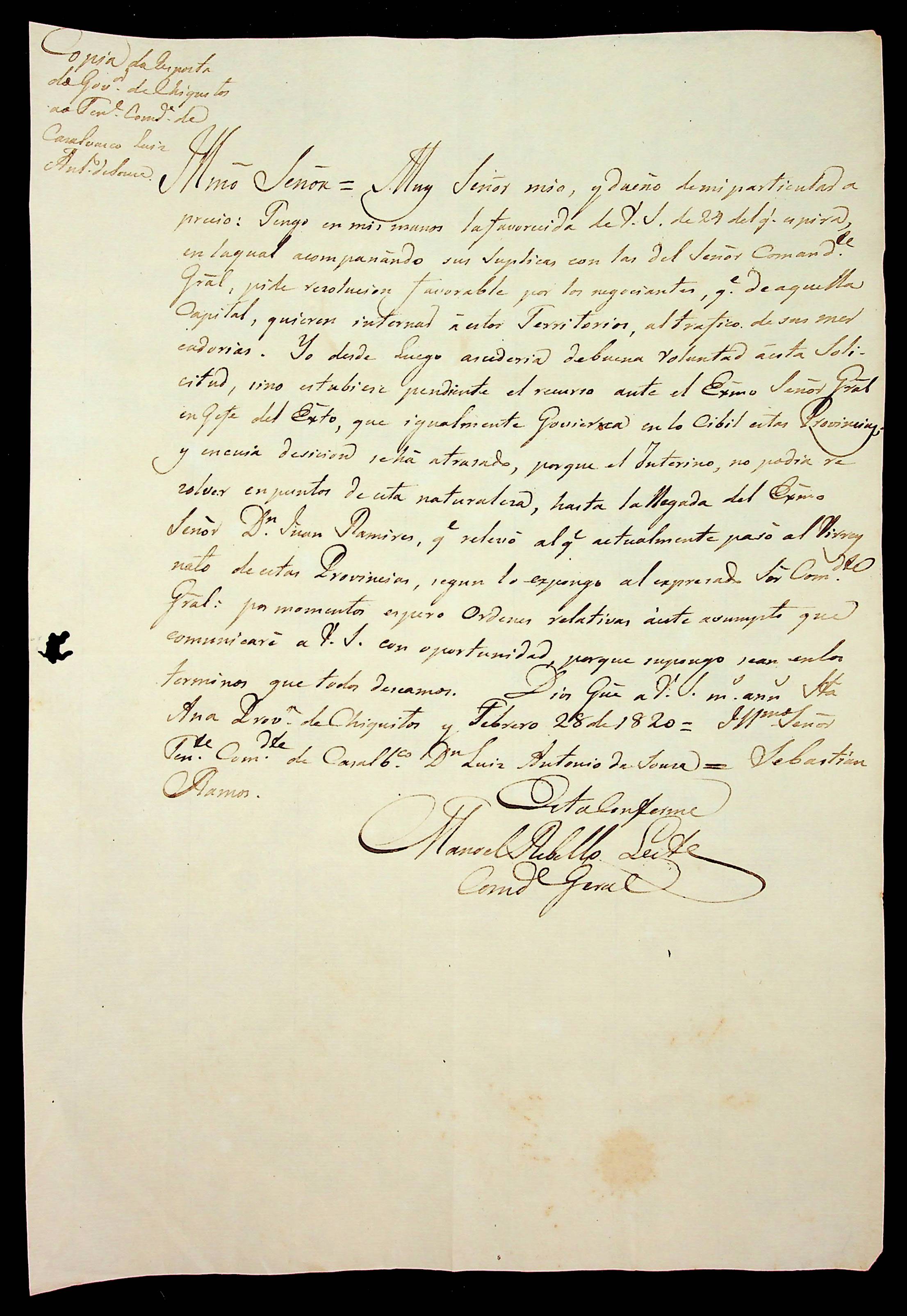 CARTA (cópia) do [Governador de Chiquitos] Sebastian Ramos ao Tenente Comandante de Casalvasco Luiz Antônio de Souza.