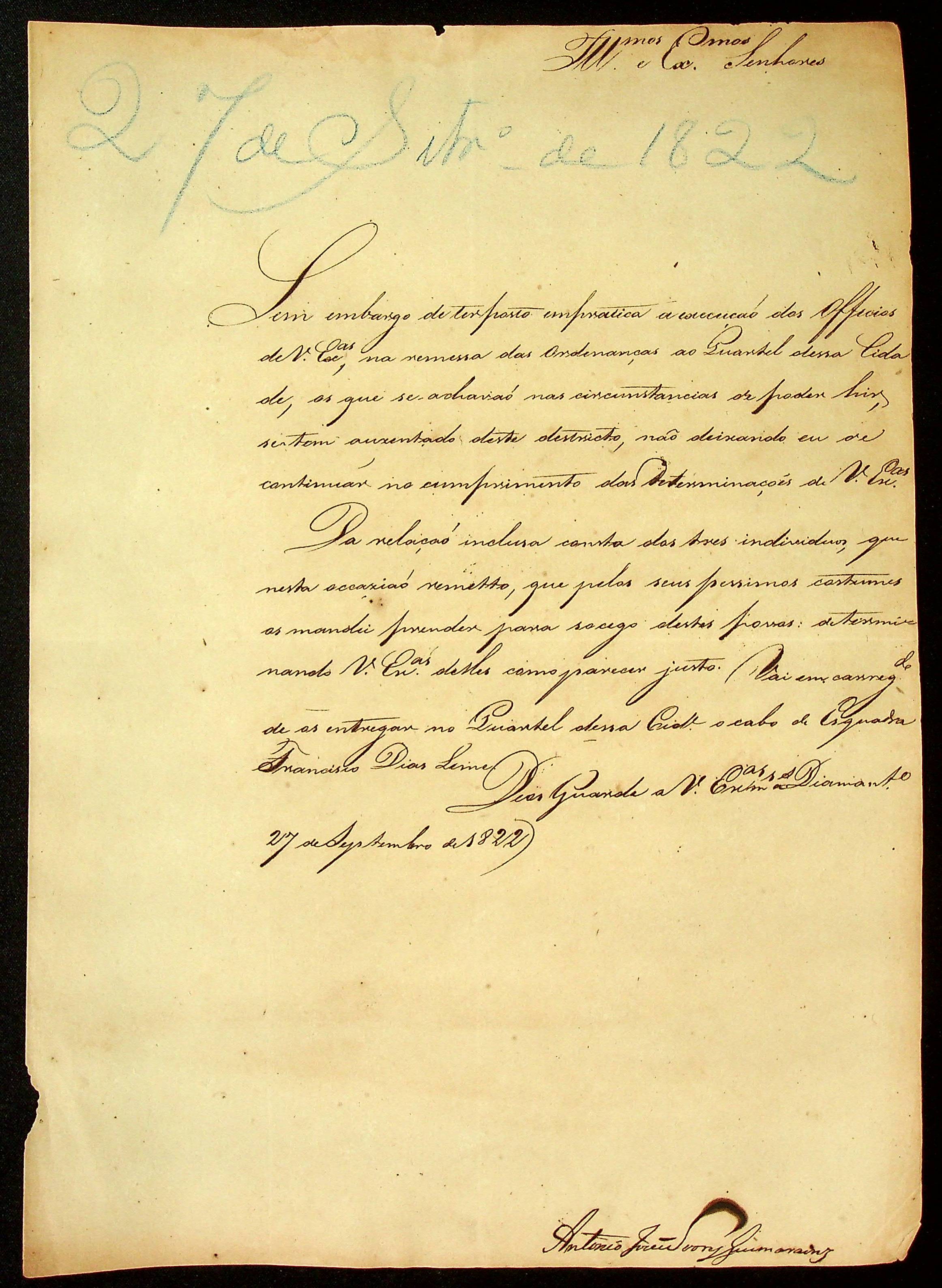 CARTA do Capitão da Companhia de Ordenanças Antônio José Soares Guimarães à [Junta Governativa Provisória].