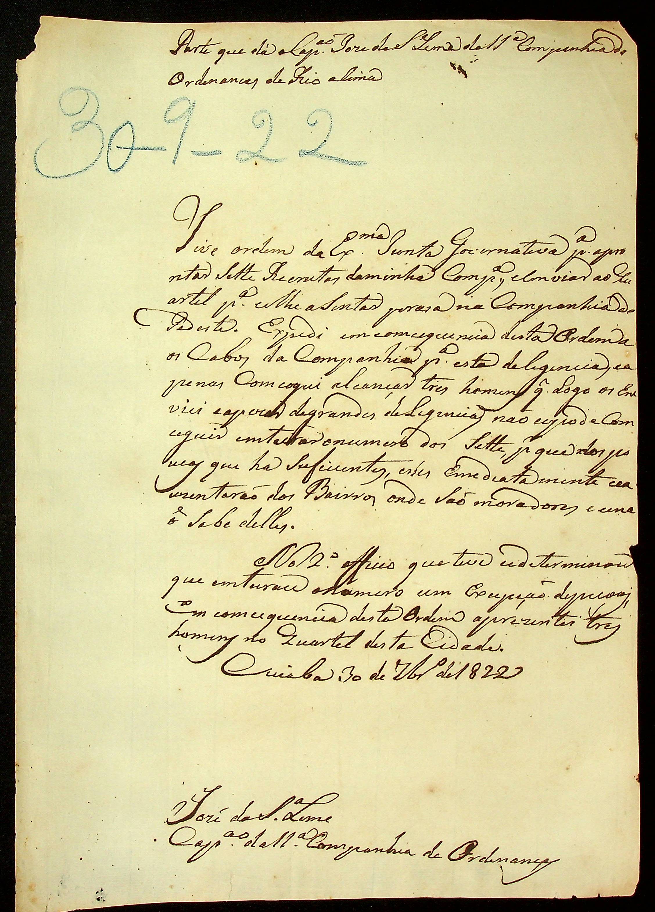 CARTA do Capitão da 11º Companhia de Ordenanças do Rio Acima José da Silva Leme á [Junta Governativa da Província].