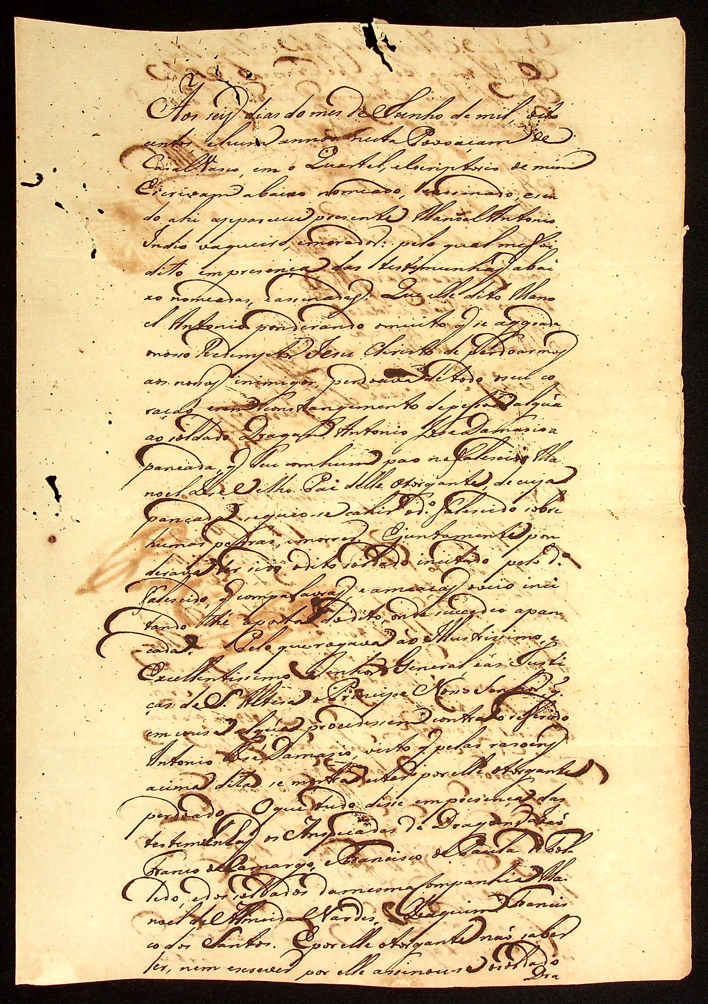 DECLARAÇÃO de Perdão de Manoel Antônio lavrada pelo Escrivão dos Reais Armazéns Antônio Thomé de França e Silva.