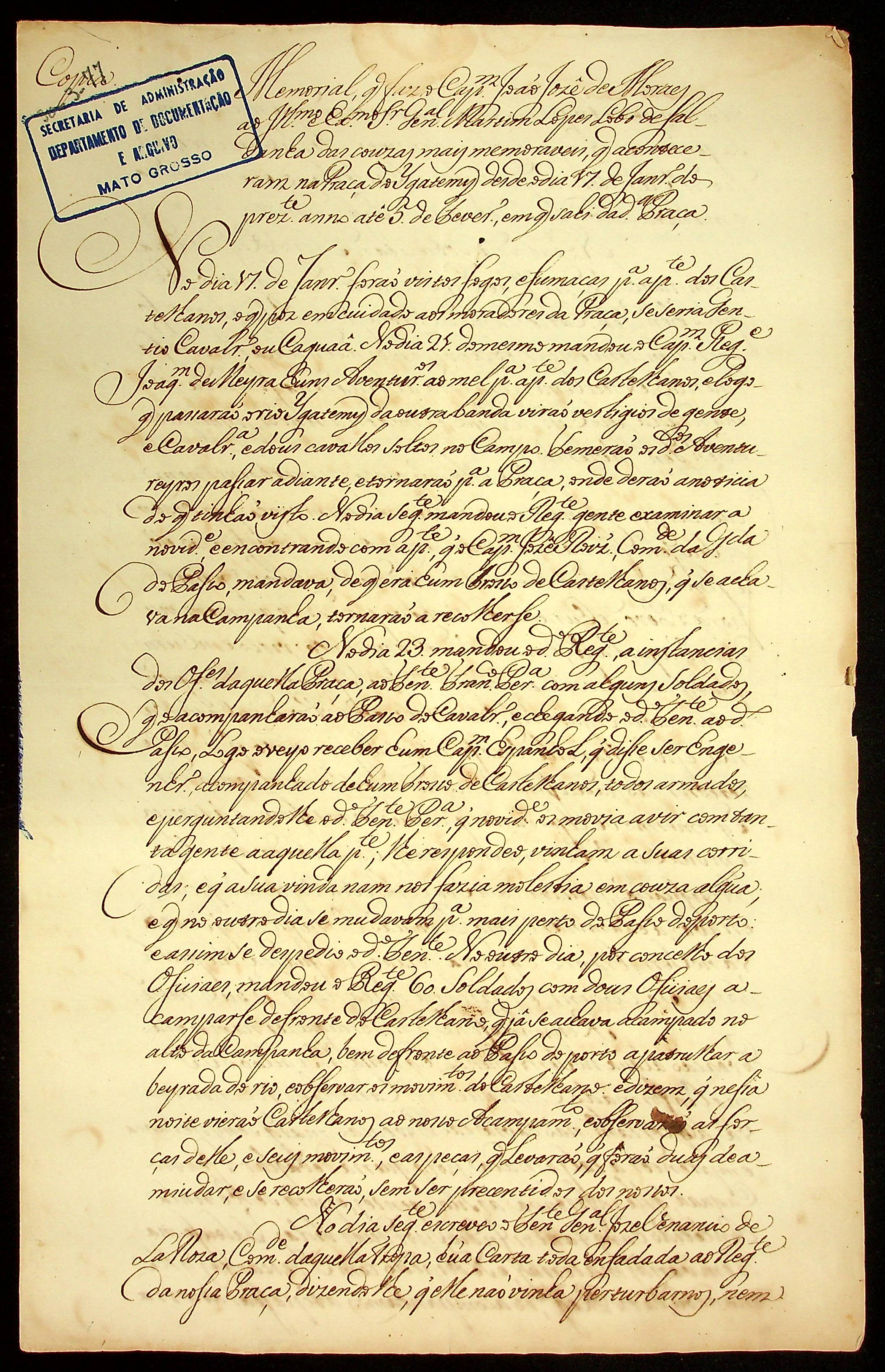 MEMORIAL (cópia) que faz o Capitão João José de Moraes ao Senhor General Martim Lopes Lobo de Saldanha das coisas menores que aconteceram na Praça Iguatemi desde o dia 17 de janeiro do presente ano até 5 de fevereiro em que sai da praça.