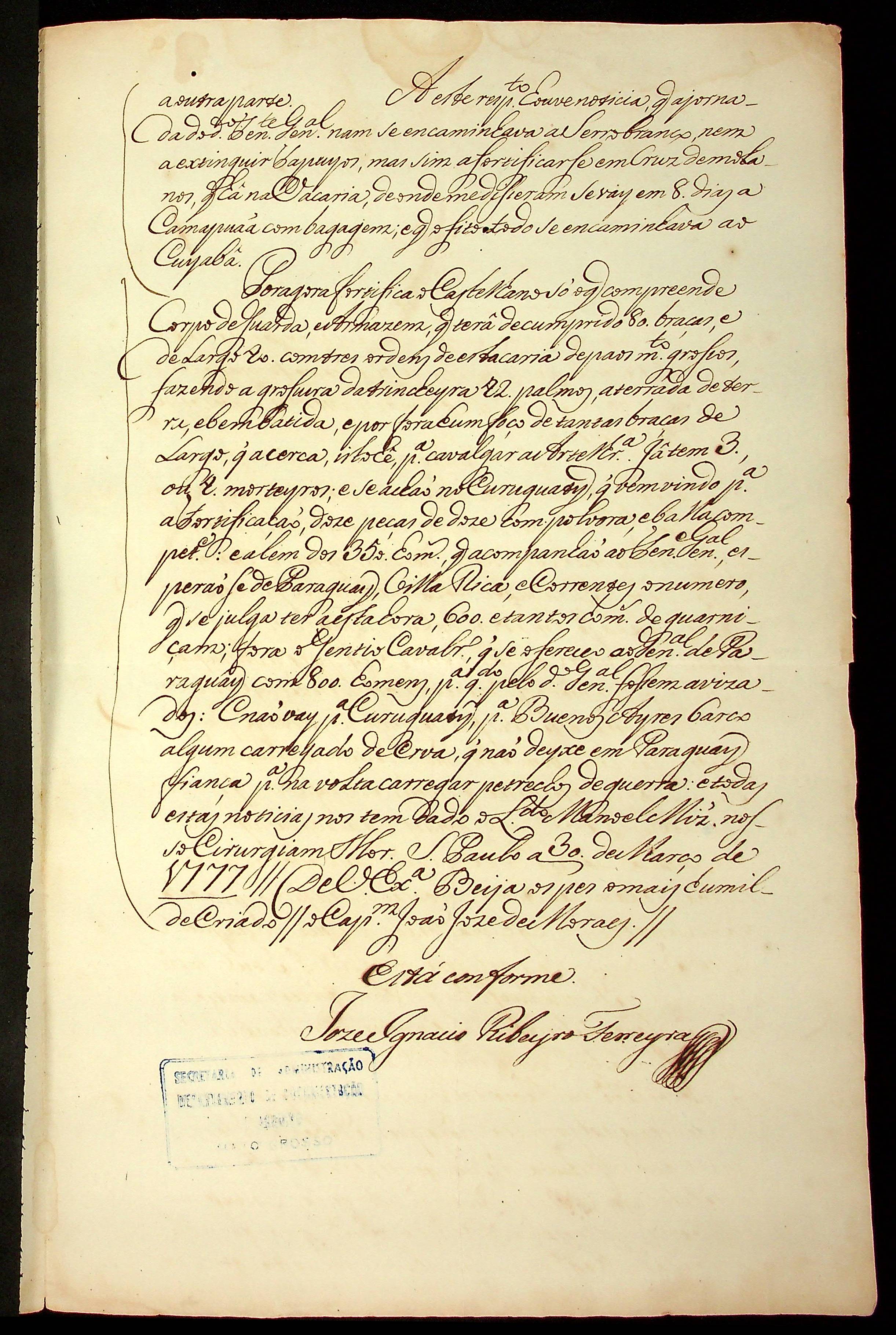 MEMORIAL (cópia) que faz o Capitão João José de Moraes ao Senhor General Martim Lopes Lobo de Saldanha das coisas menores que aconteceram na Praça Iguatemi desde o dia 17 de janeiro do presente ano até 5 de fevereiro em que sai da praça.